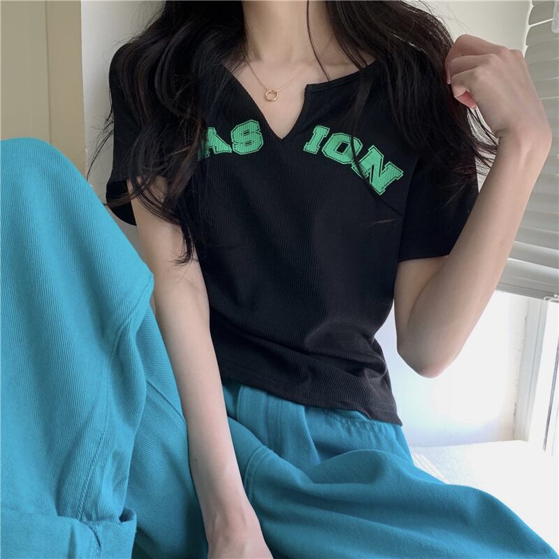 Black letter short-sleeved T-shirt women's summer 2022 new design sense niche retro Hong Kong flavor slim top ins tide ブラック レトロ サマー 夏物 スリム Tシャツ s576134699485442