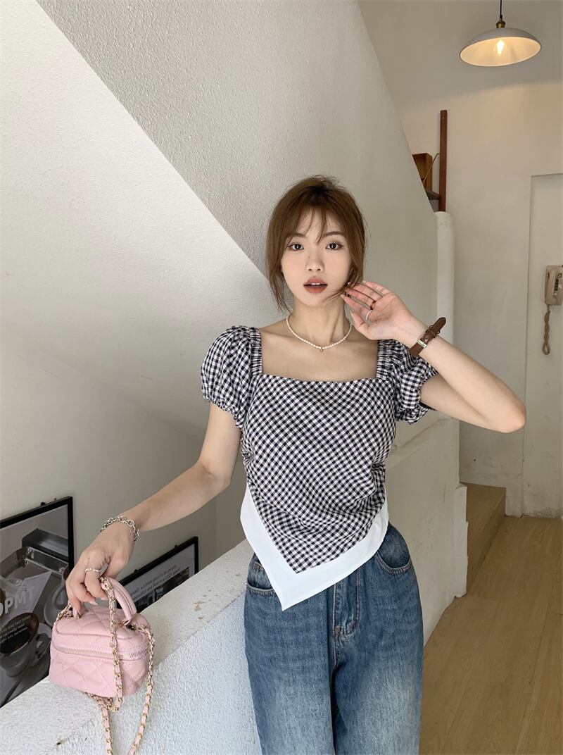 Hot plaid short-sleeved T-shirt women's summer design sense 2022 new irregular slim square collar short top clothes ショート サマー 夏物 スリム Tシャツ スクウェア s576157837493861