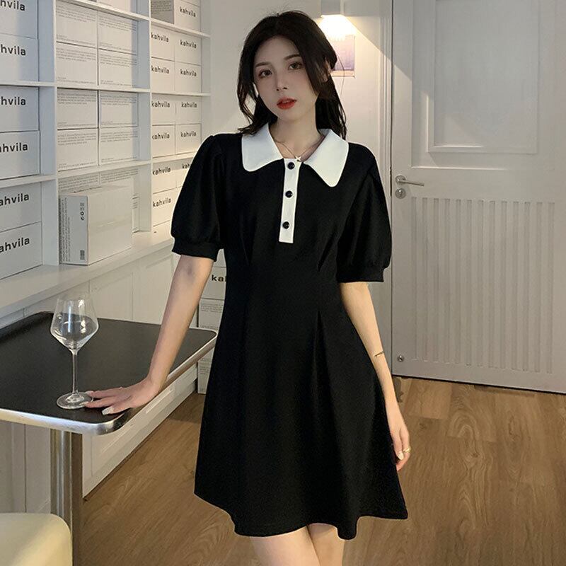 Black puff sleeve polo collar dress women's summer 2022 new small western style age-reducing milk sweet skirt ブラック 大人ガーリー スウィート キュート カジュアル サマー 夏物 スカート s576152126609194