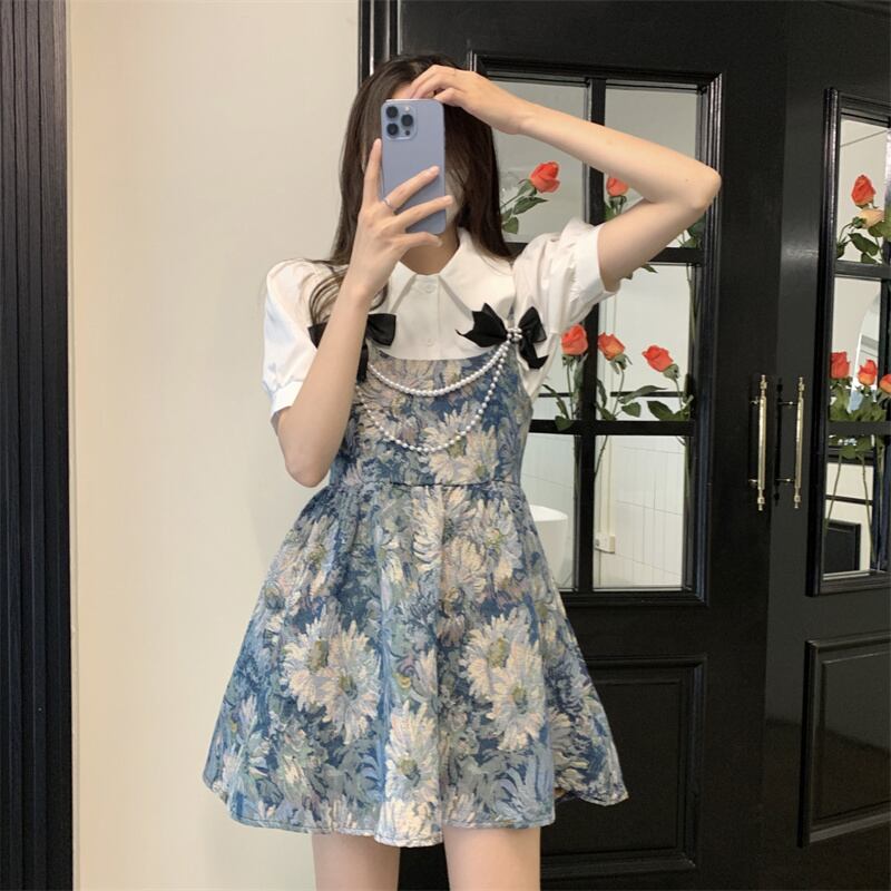French heavy industry pearl bow suspender skirt female 2022 summer new retro bear print dress short skirt ショート リボン レトロ サマー 夏物 スカート パール 真珠 s576127128359114