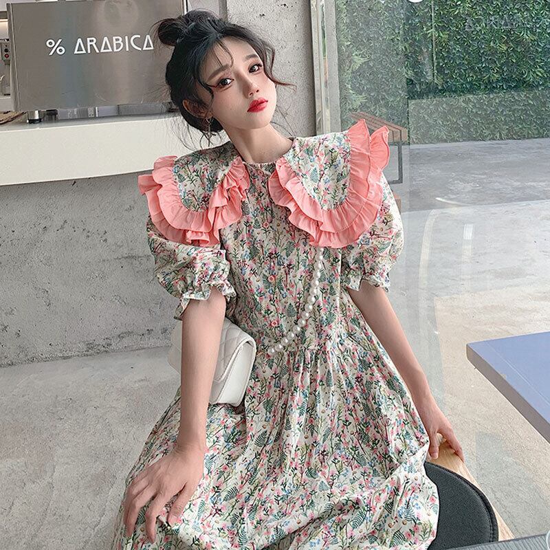 Doll Collar Floral Dress Summer 2022 Sweet and Chic Small Puff Sleeve Long Skirt ロング 大人ガーリー スウィート キュート カジュアル サマー 夏物 花柄 スカート s576128887461274