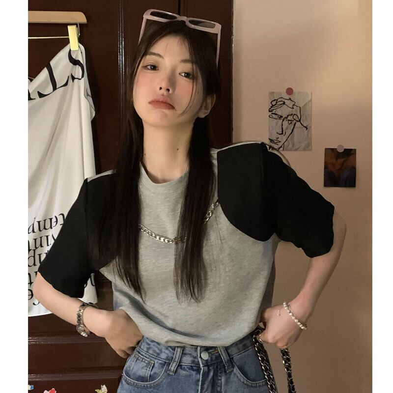 Contrast color short-sleeved T-shirt women's design sense niche summer 2022 new American retro fashion shoulder top ins tide レトロ サマー 夏物 Tシャツ s576139272437493