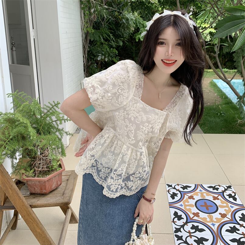 French gentle wind square collar top women's summer high-end design sense niche style puff sleeve lace shirt レース サマー 夏物 スクウェア s57612459738083