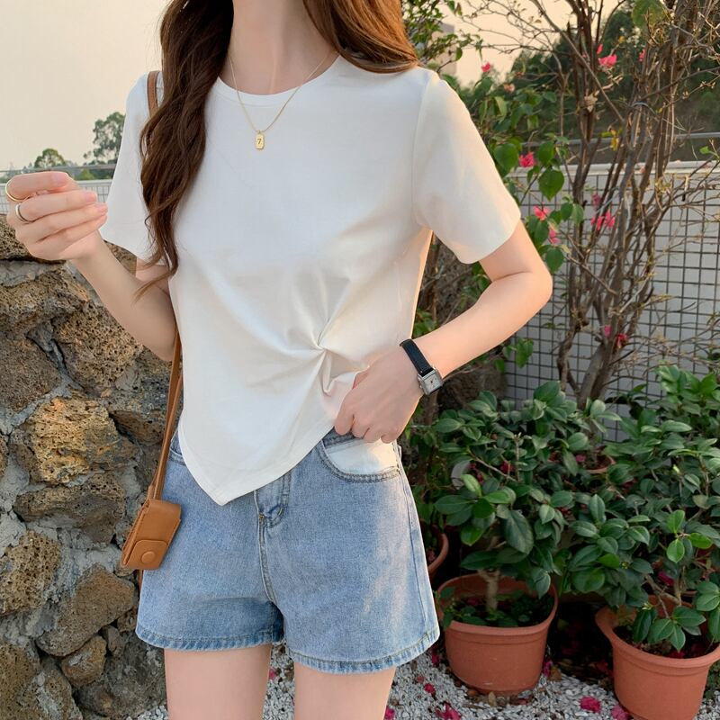 Front-shoulder short-sleeved T-shirt women's design sense niche summer 2022 new sweet chic irregular short top ショート 大人ガーリー スウィート キュート カジュアル サマー 夏物 Tシャツ s576145920131306