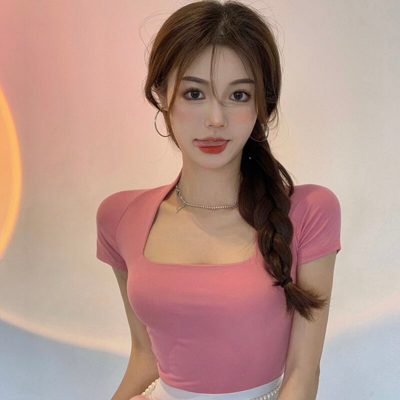 Sweet Spice Girl Short Top Women's Sense Small Summer Pure Desire Chic Slim Square Neck Black Short Sleeve T-Shirt ins ショート ブラック 半袖 ハーフスリーブ 大人ガーリー スウィート キュート カジュアル サマー 夏物 スリム Tシャツ ピュア スクウェア s576120101337958