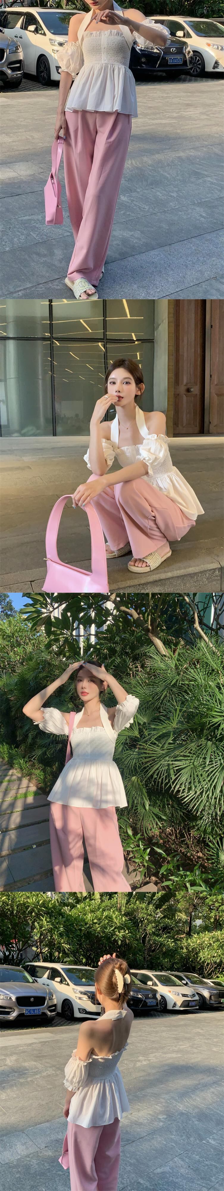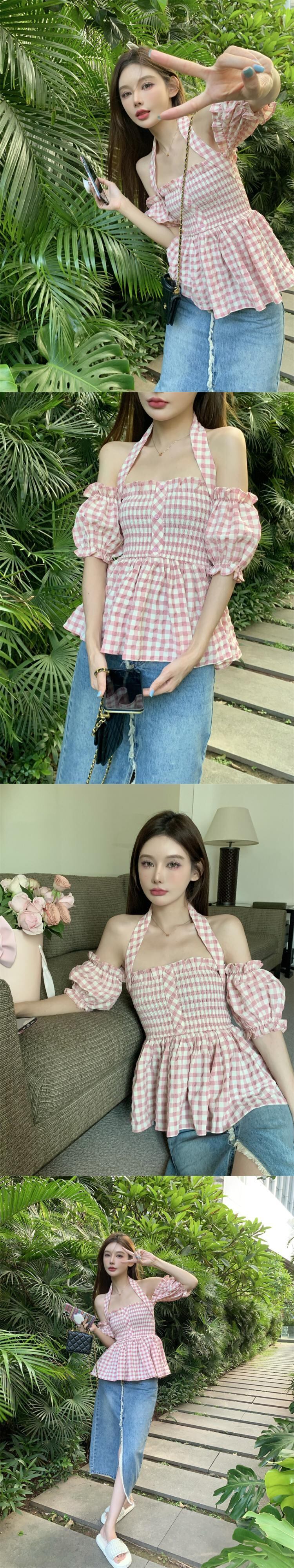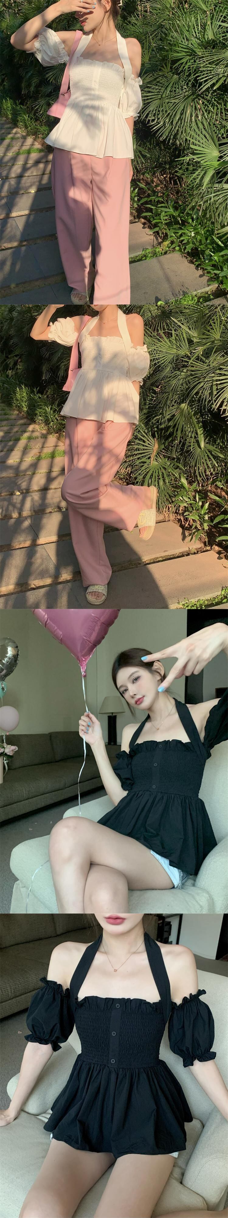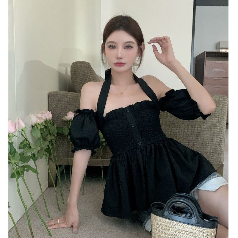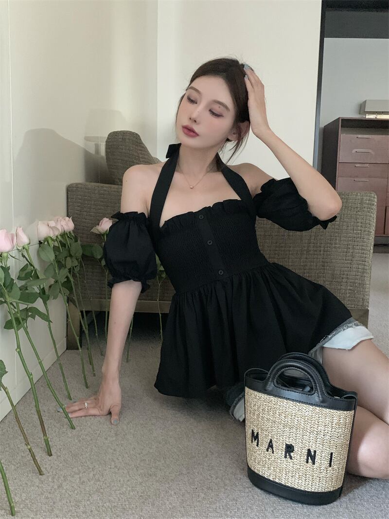 ホルターショートトップス サマーブラックスリーブシャツ 大人ガーリー スウィート キュート カジュアル 夏物 オフショルダー s576177033252002