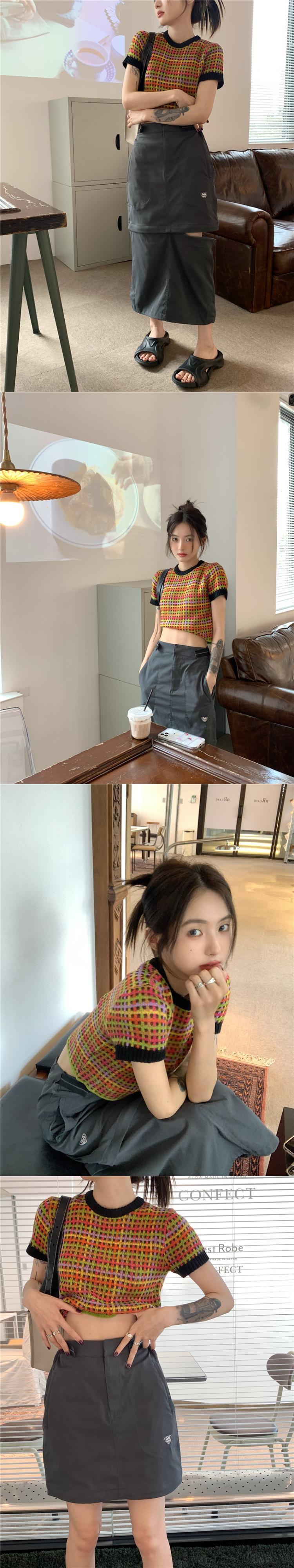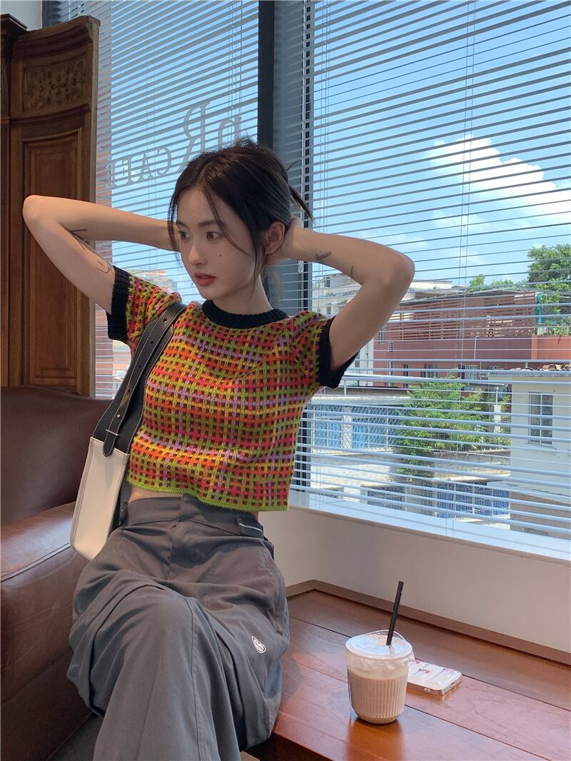 半袖スリーブニットセーター サマーストライプトップス ショート ハーフスリーブ 大人ガーリー スウィート キュート カジュアル 夏物 s576149792718478