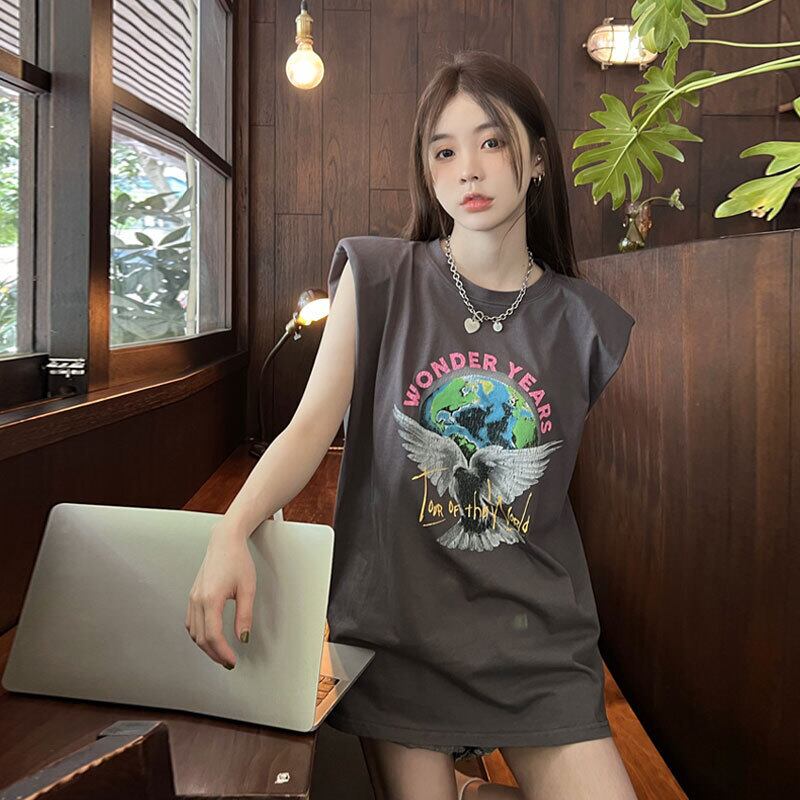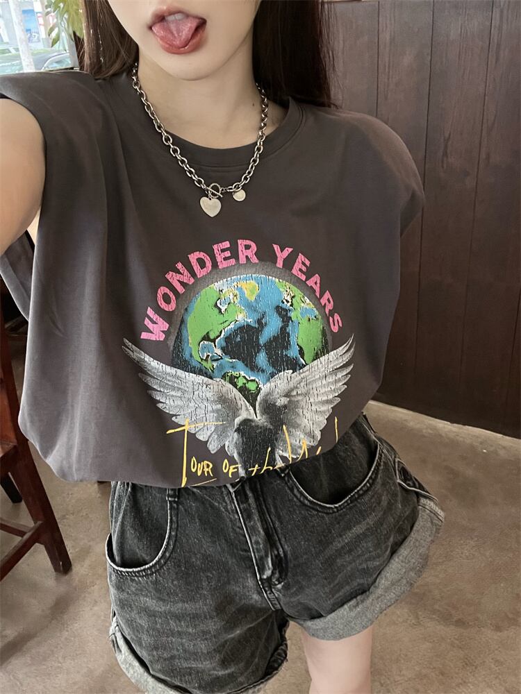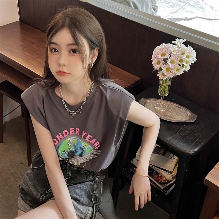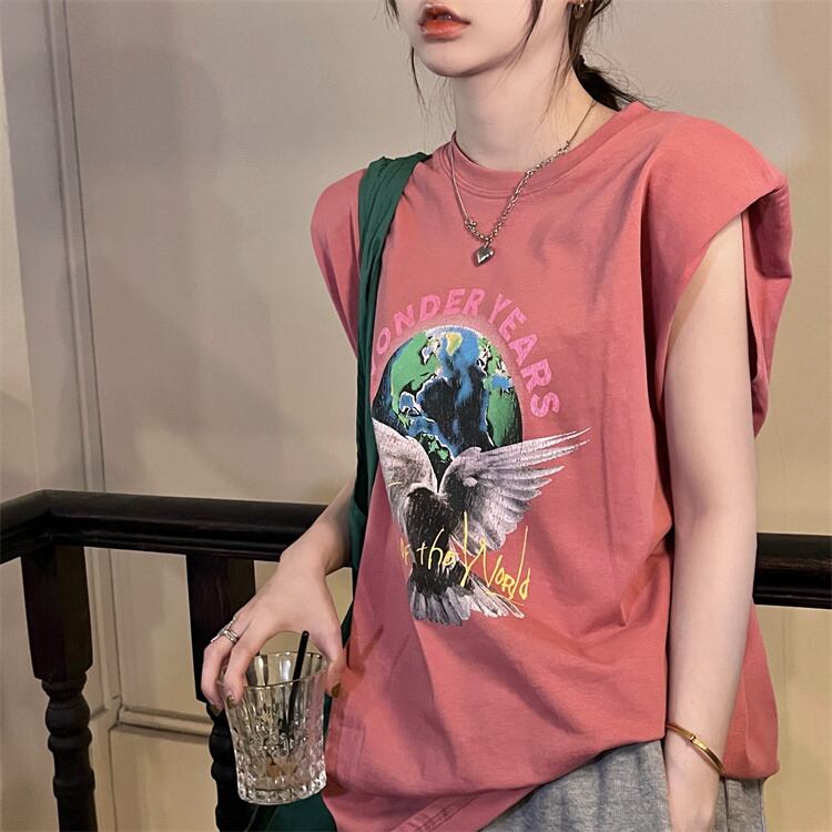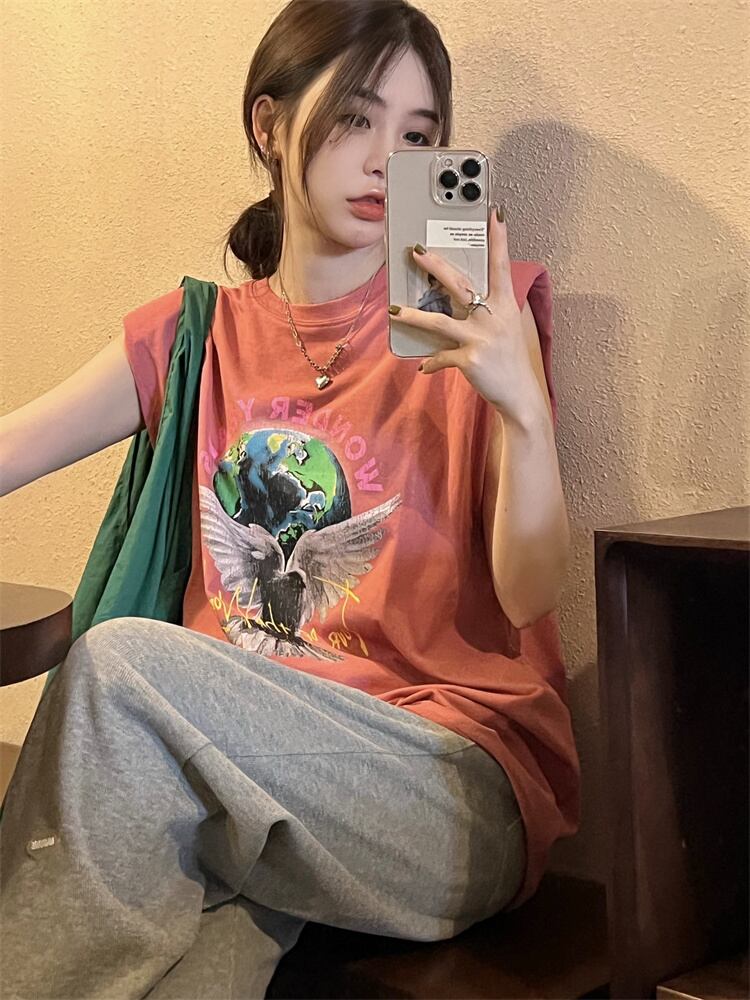 スタンダードプリントパターンノースリーブTシャツ サマートップス レトロ 夏物 s576117836458848