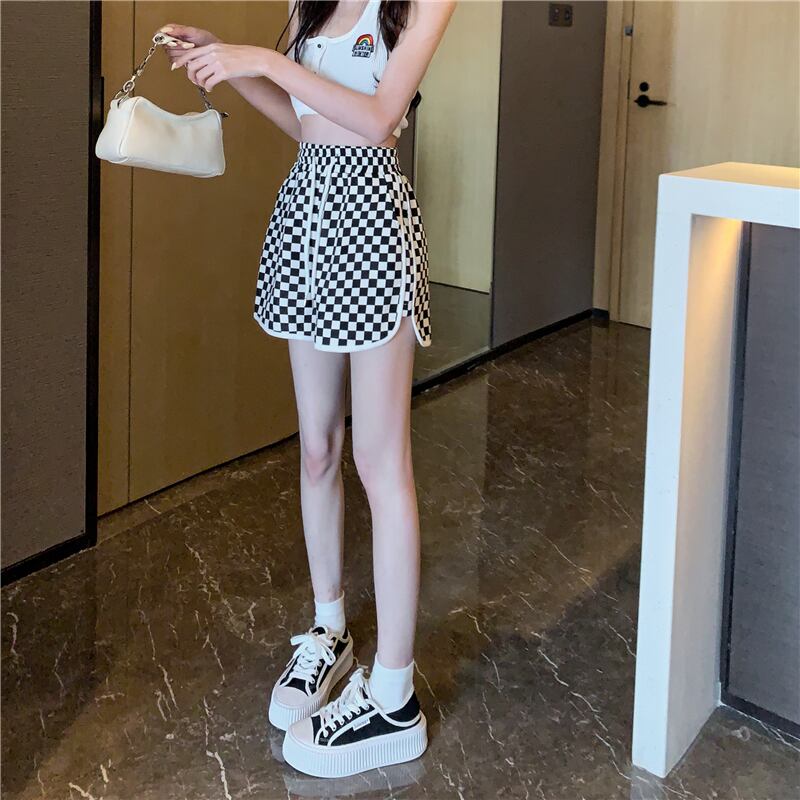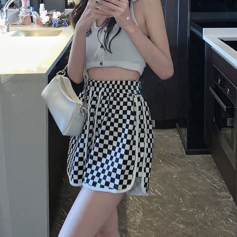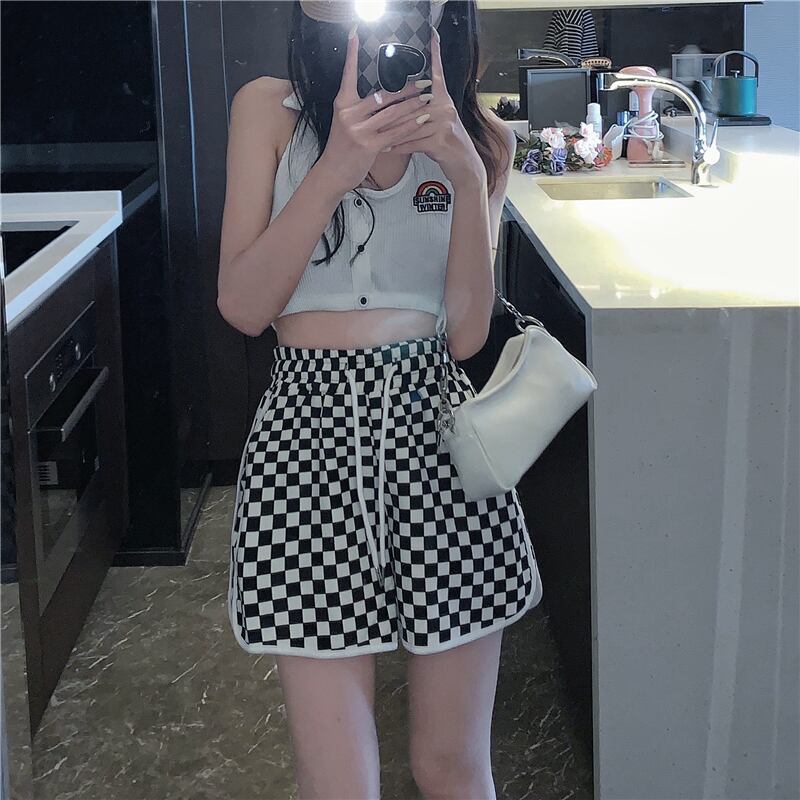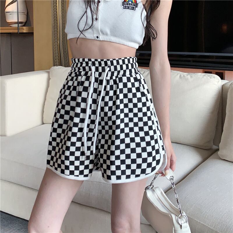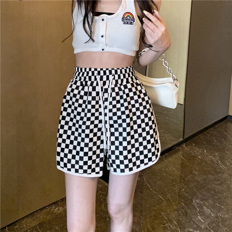 格子柄カジュアルショーツ サマーハイウェストウェストルーズワイドレッグパンツ 夏物 ブルマー ワイドパンツ s576142566332018