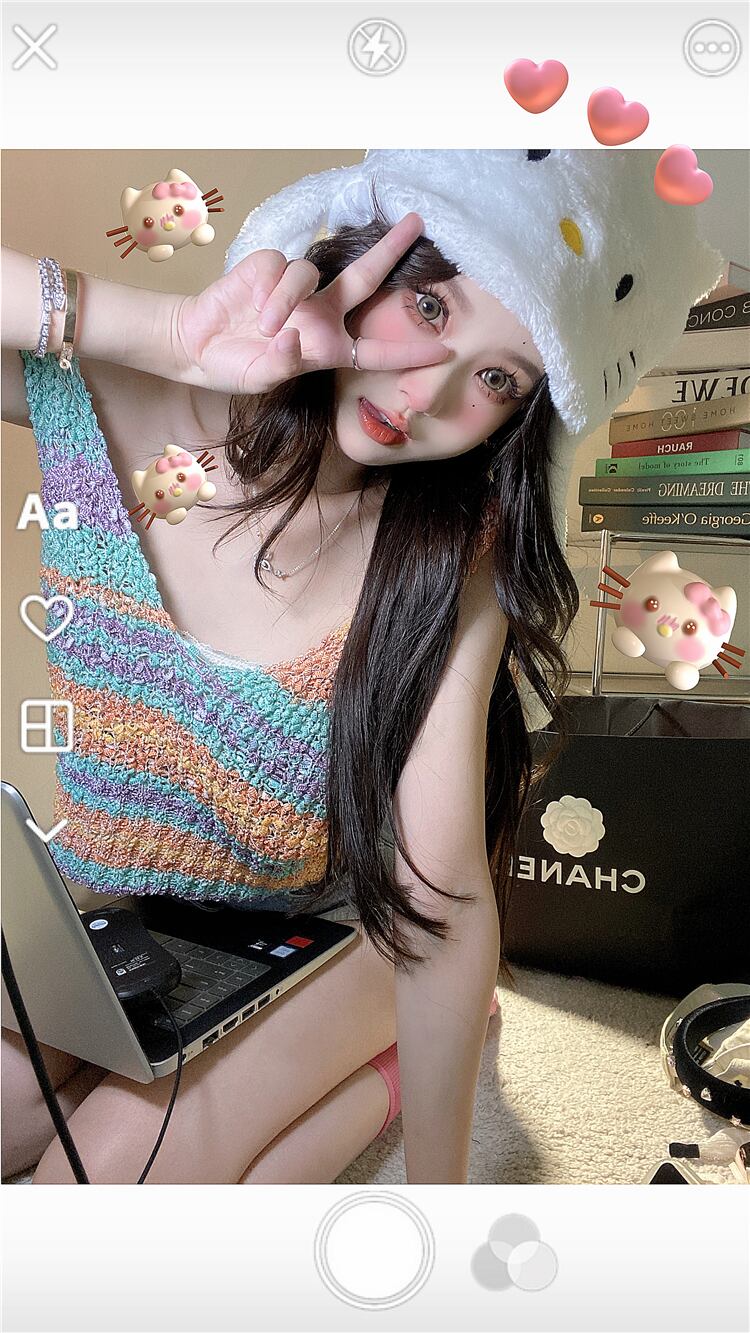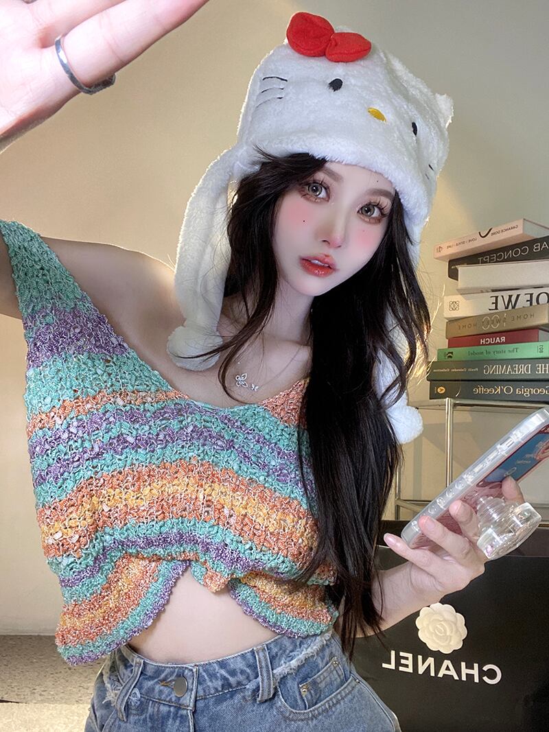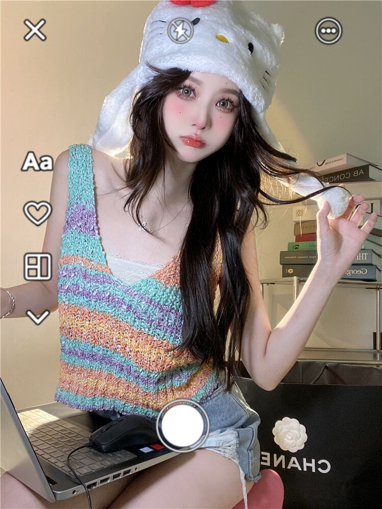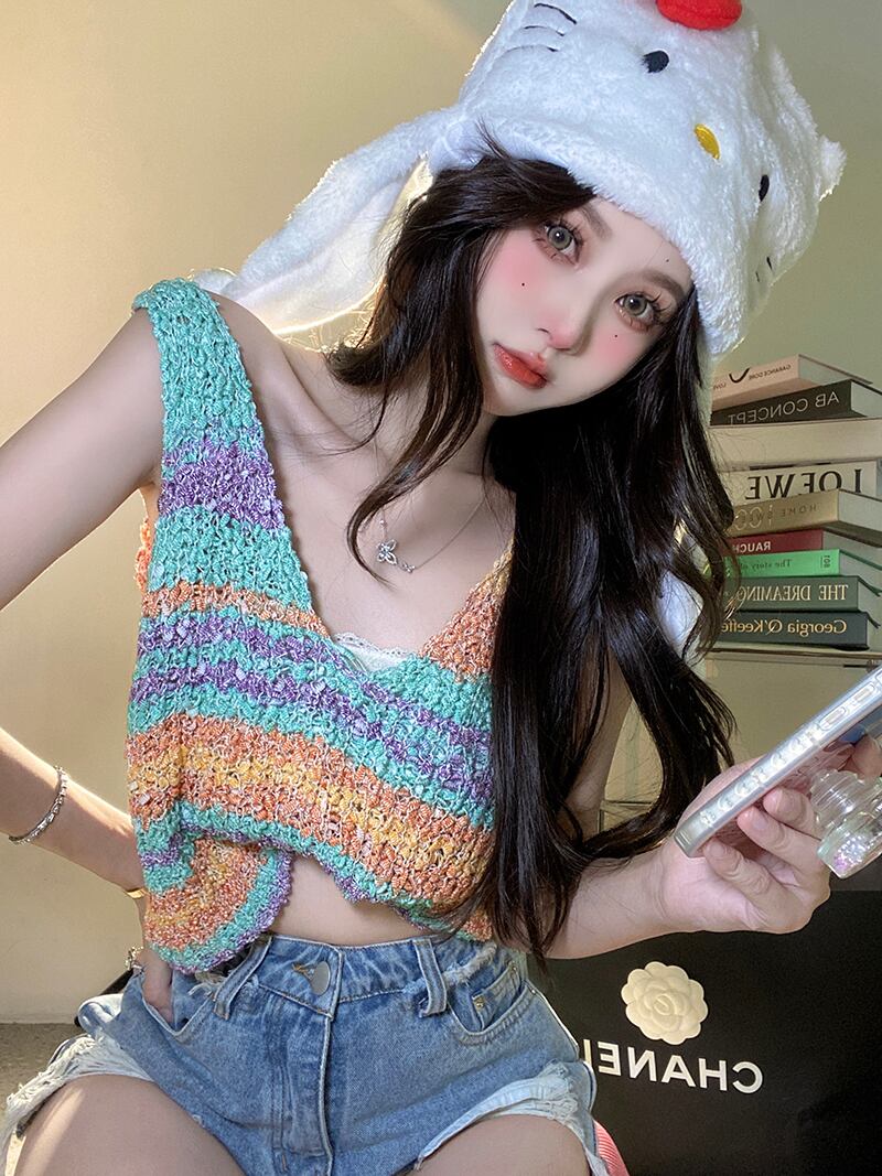 カラーストライプサマーノースリーブルーズニットショートトップス 大人ガーリー スウィート キュート カジュアル 夏物 s576182885453058