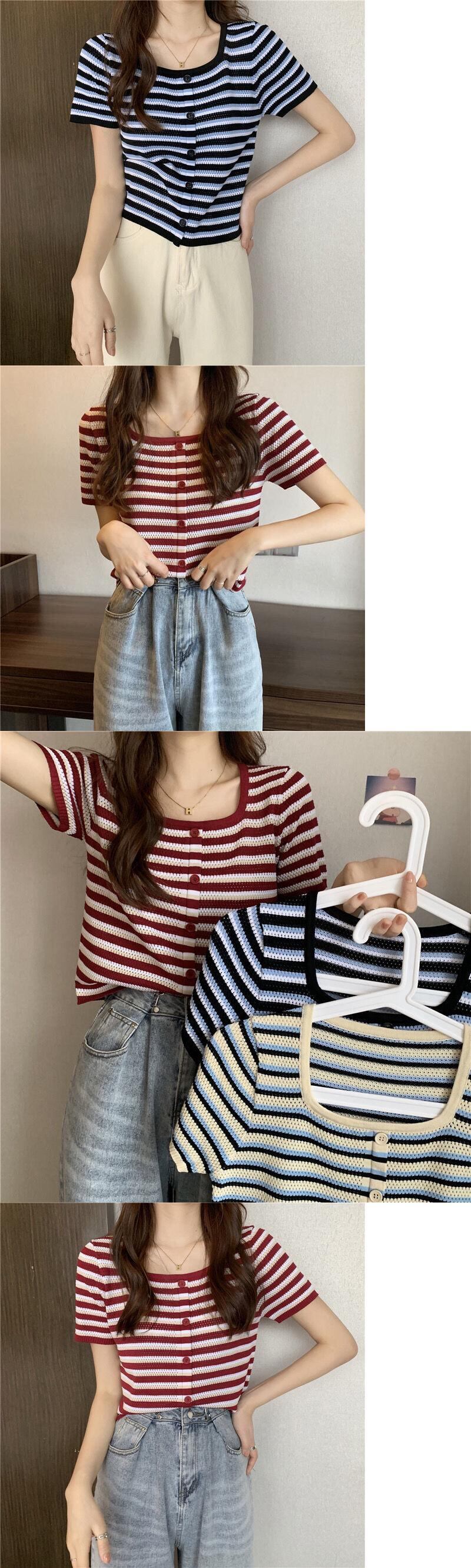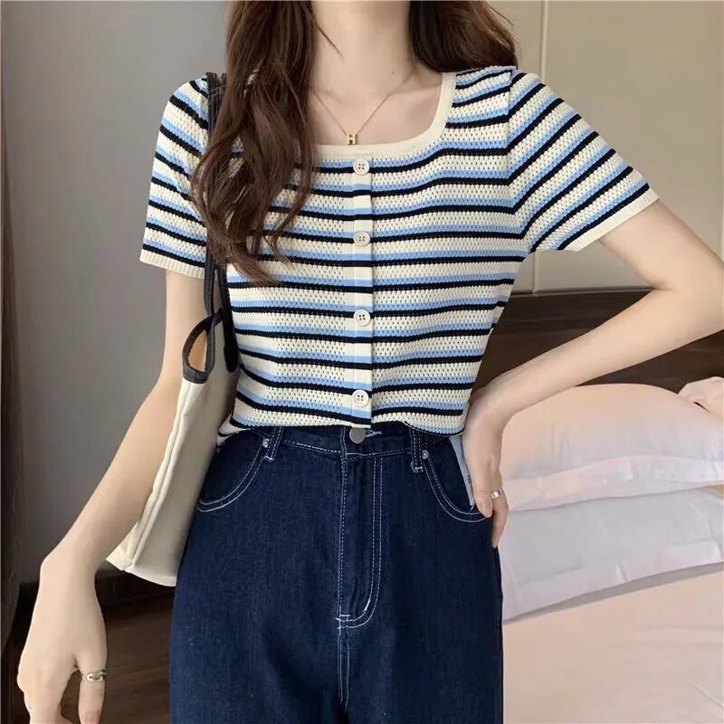 ショートストライプセーター 薄手サマーTシャツ トップス 夏物 シルク スクウェア s576171472864498