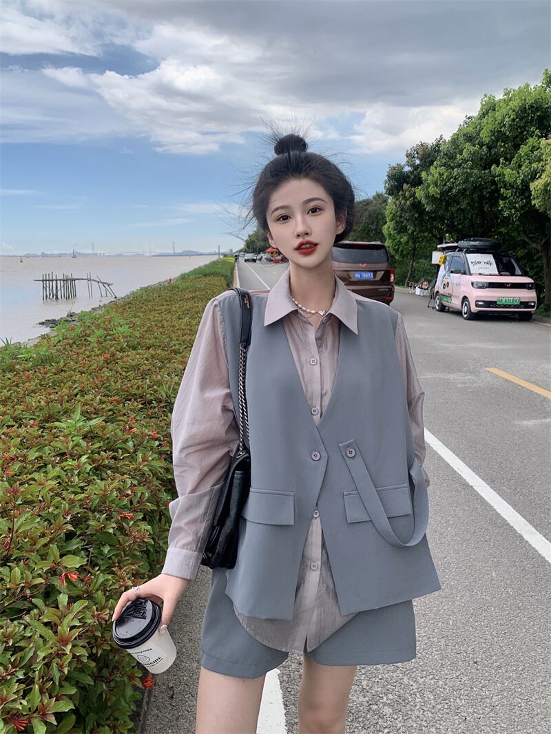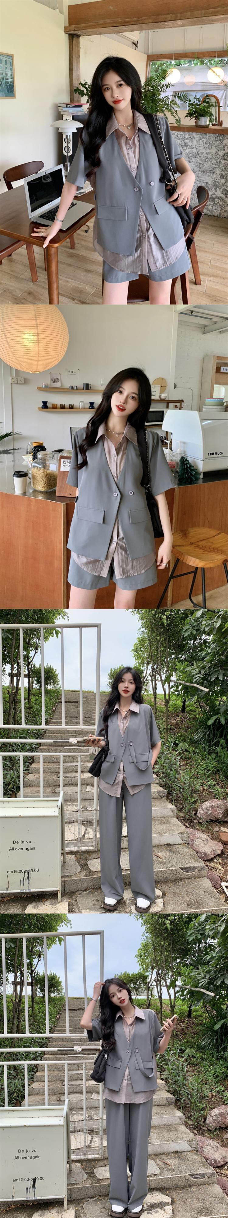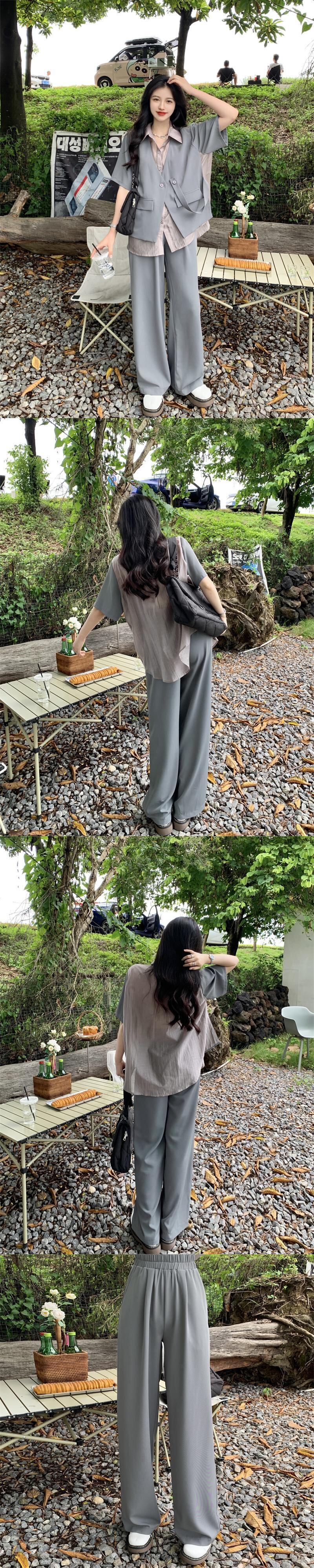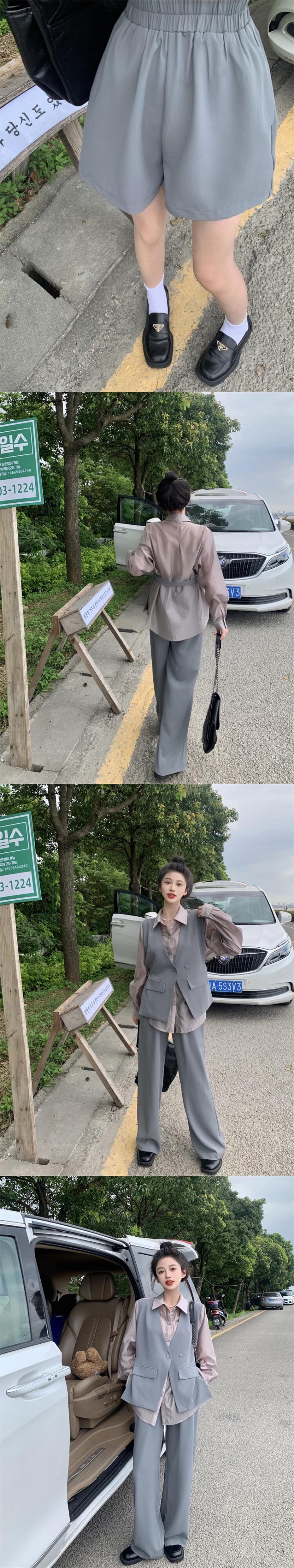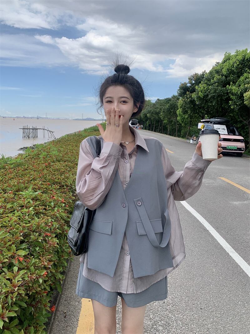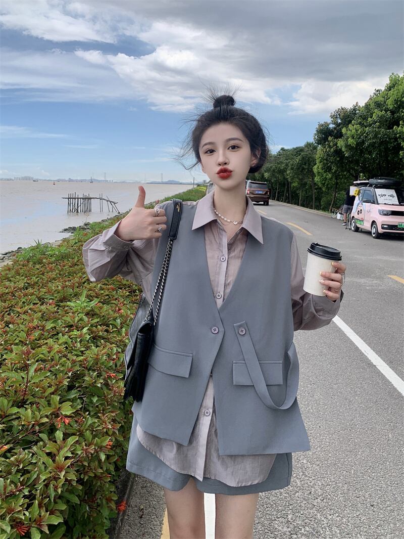 色:グレーFakeTwoPieceLong袖丈Shirt,グレーFakeTwoPieceShort袖丈Shirt,グレーshorts,グレーtrousers