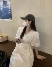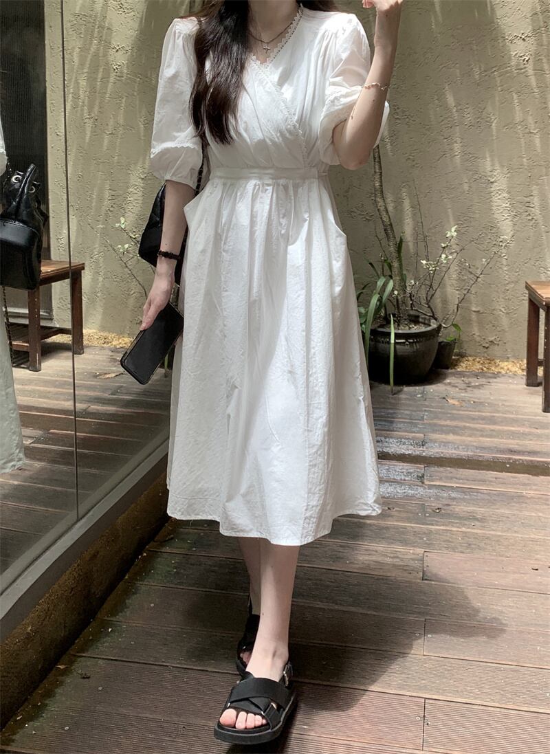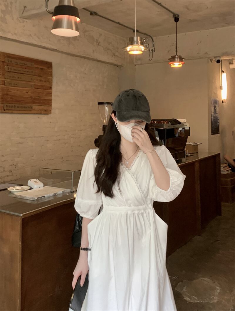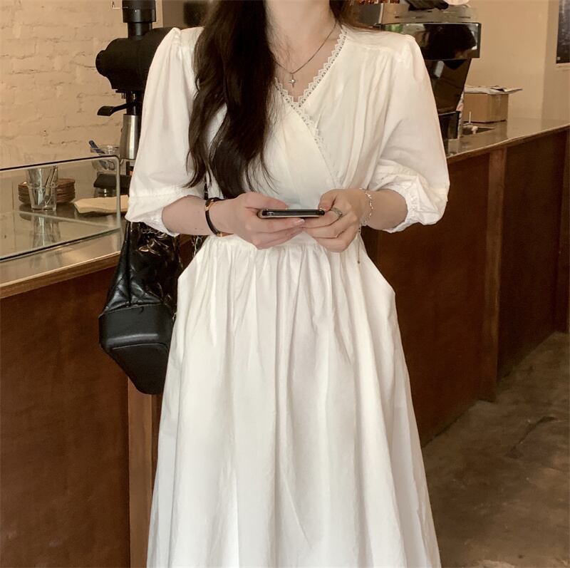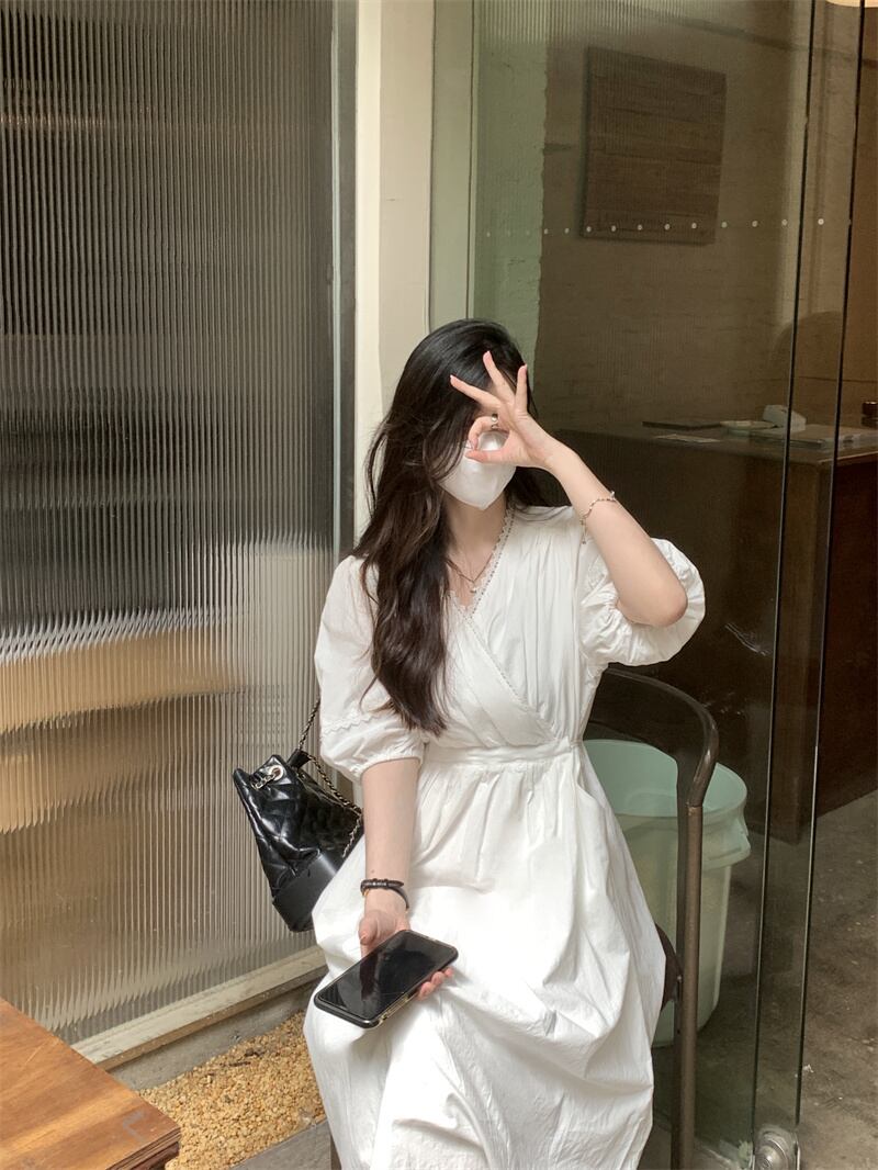 ホワイトドレス サマースタイルVネックウェスト薄手スカート 夏物 フラワーデザイン s576181137491405