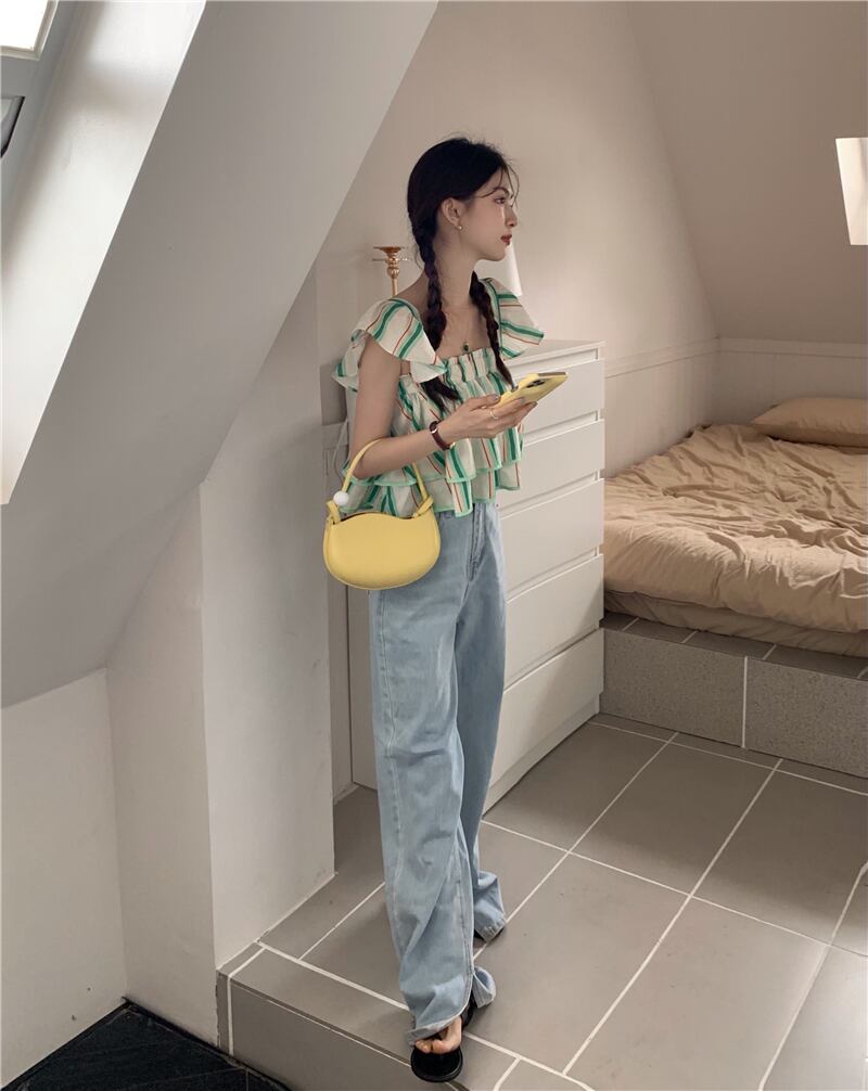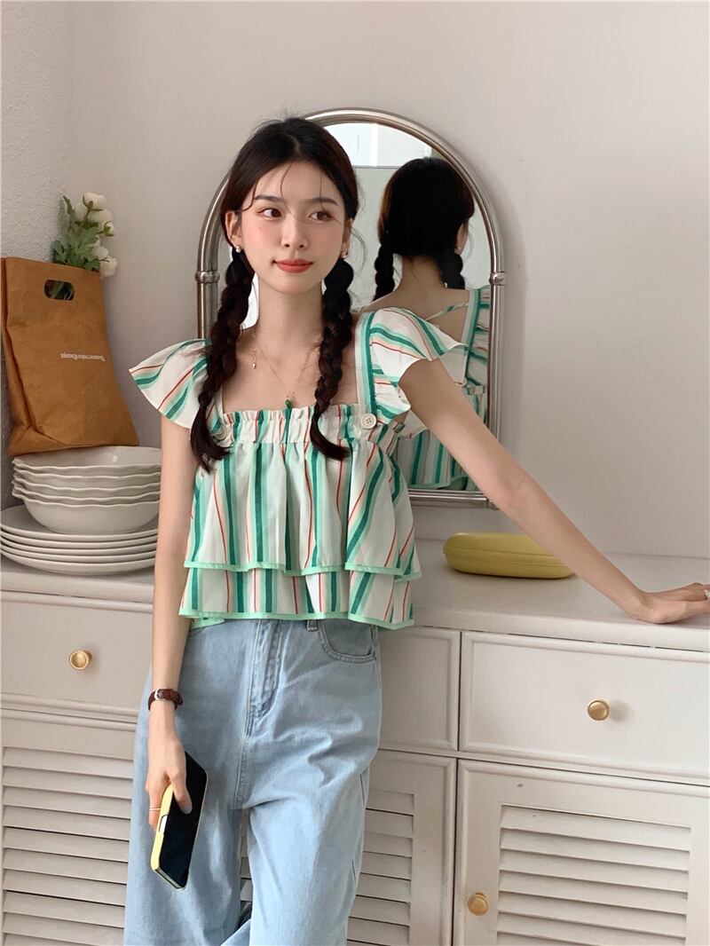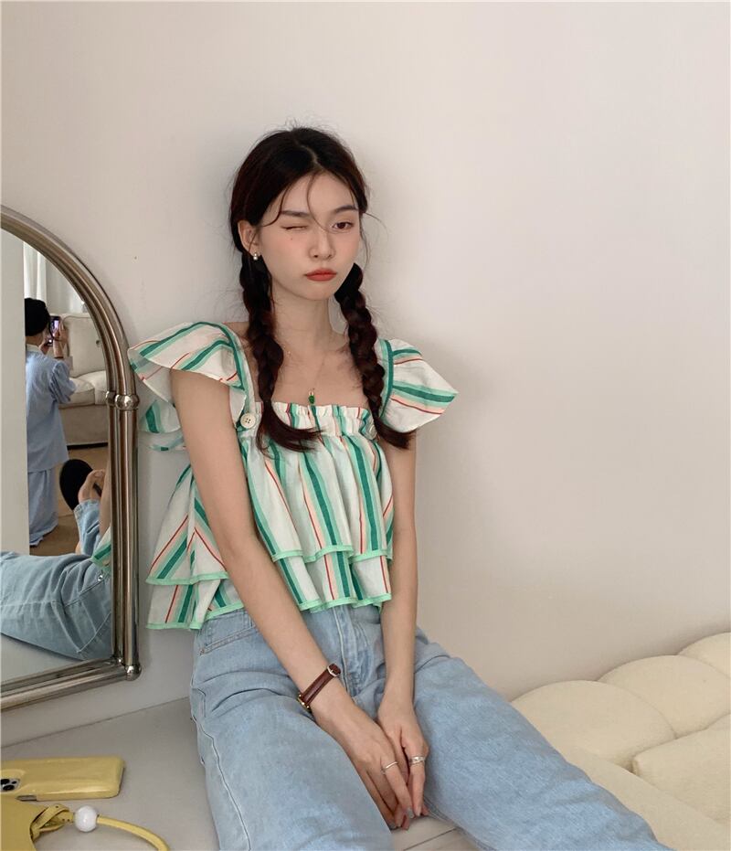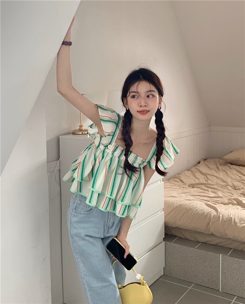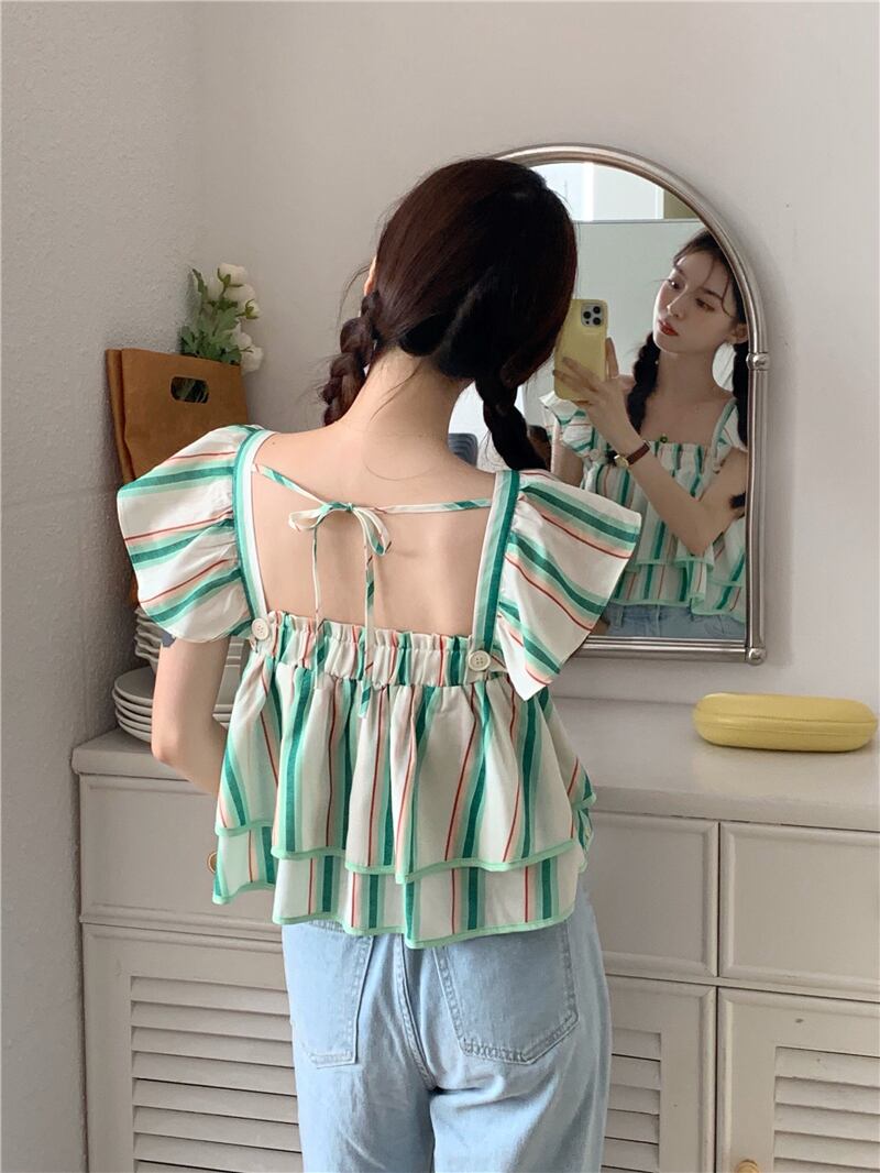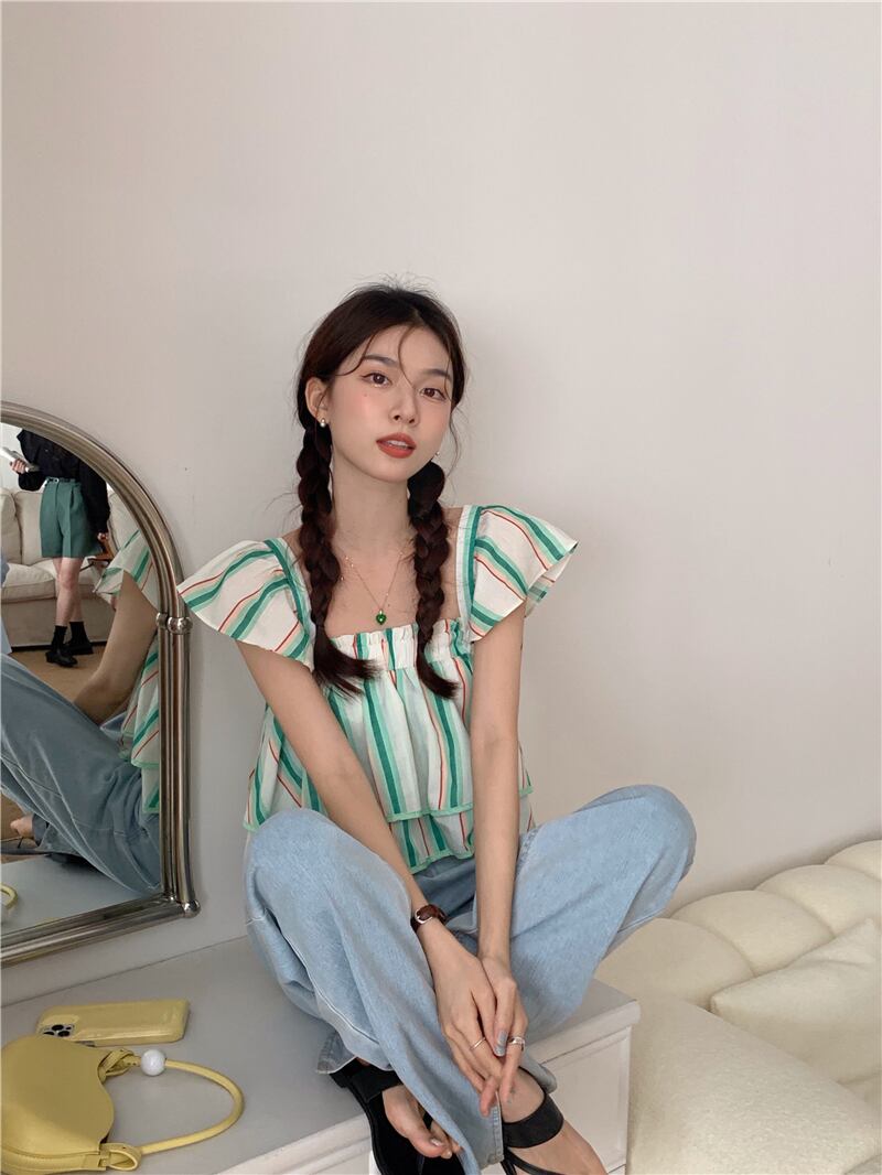 スリーブトップス サマーレディーススタイルカラーシャツ ショートストライプ 夏物 スクウェア s576192423507189