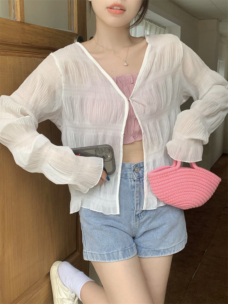 プリーツVネックシャツ サマールーズ薄手トップス カーディガン ロング 夏物 s576179615915863