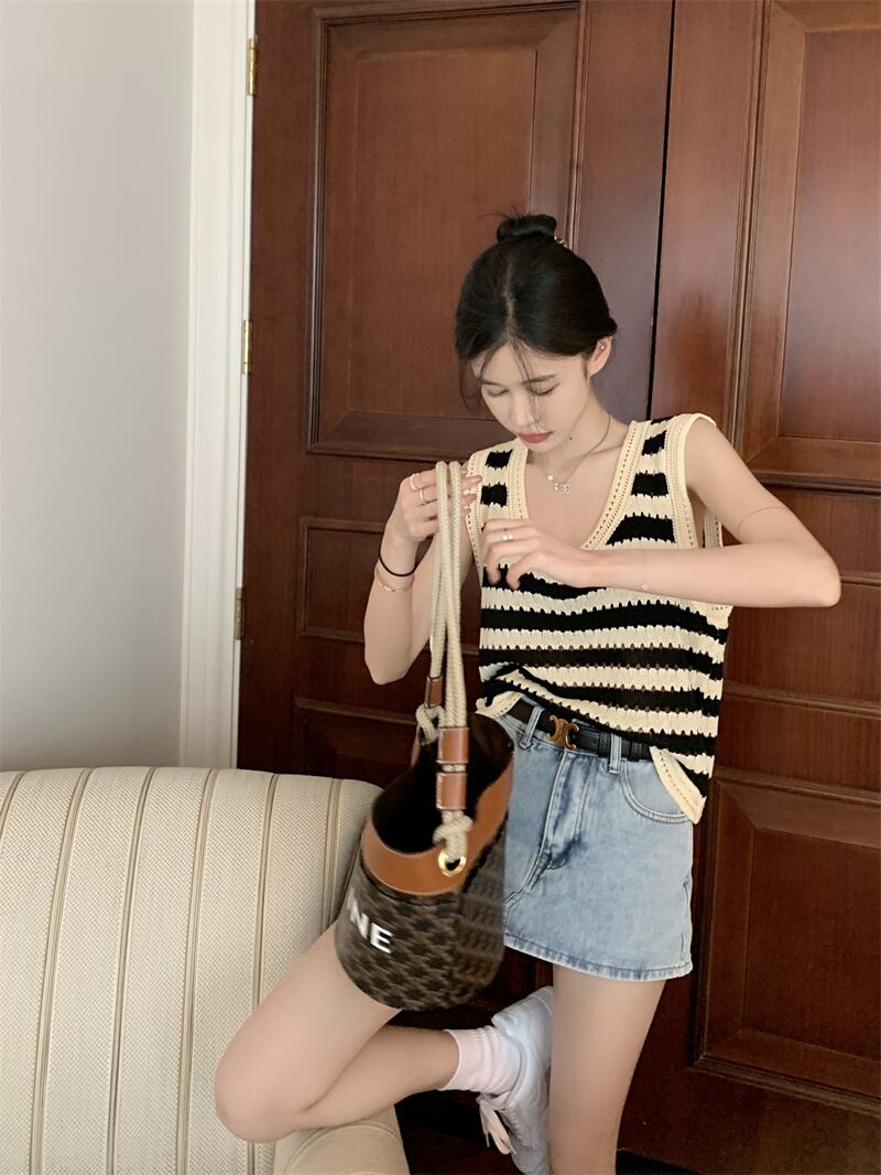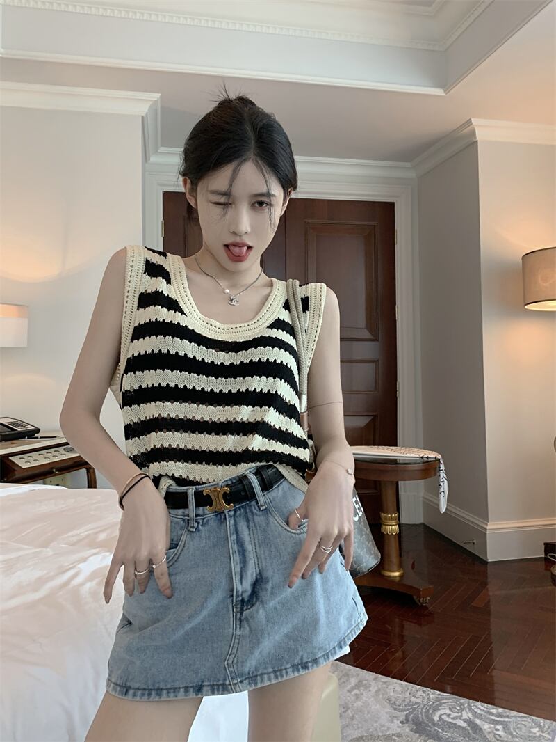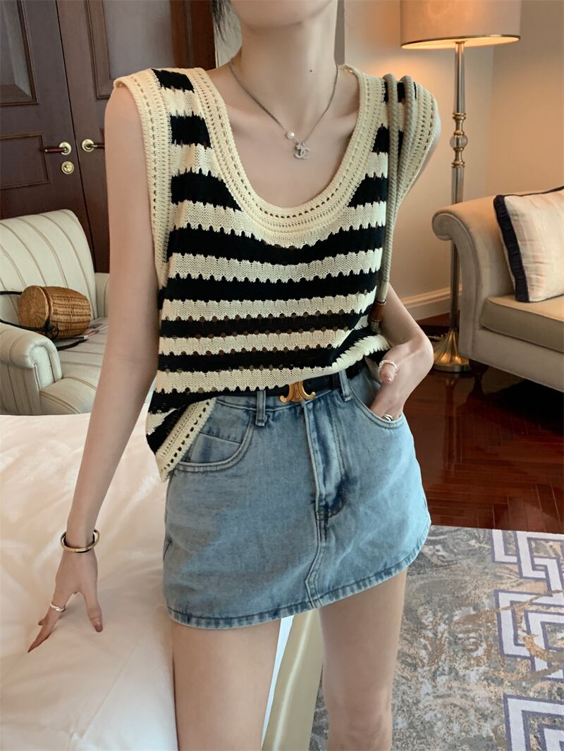 ストライプニットサマールーズノースリーブトップス 薄手シャツ 大人ガーリー スウィート キュート カジュアル 夏物 s576115555552823