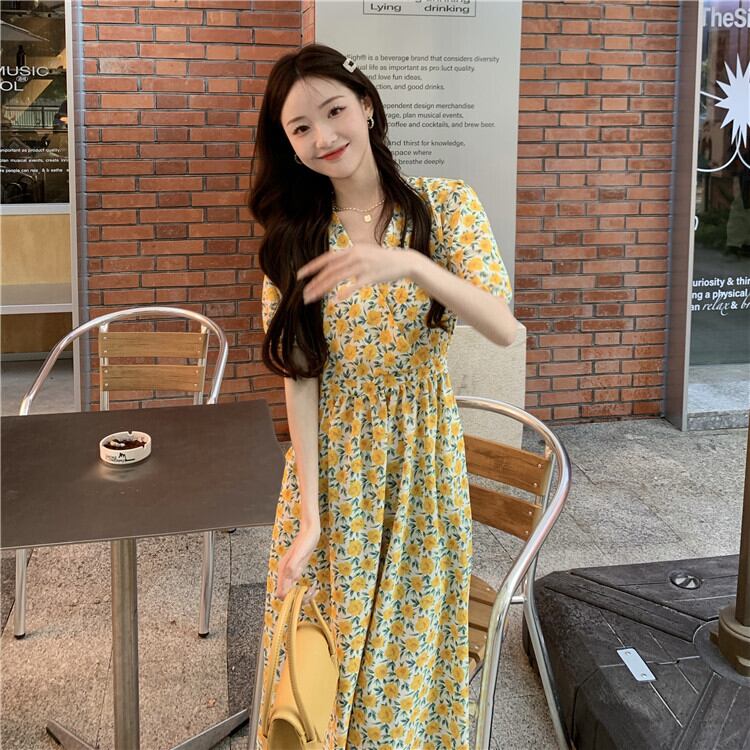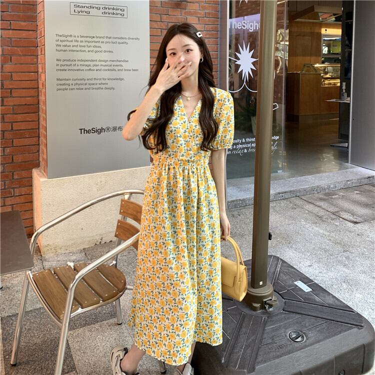 フローラルドレス サマーロングスカート ウェストスリムVネック 夏物 花柄 フラワーデザイン s576117962333258