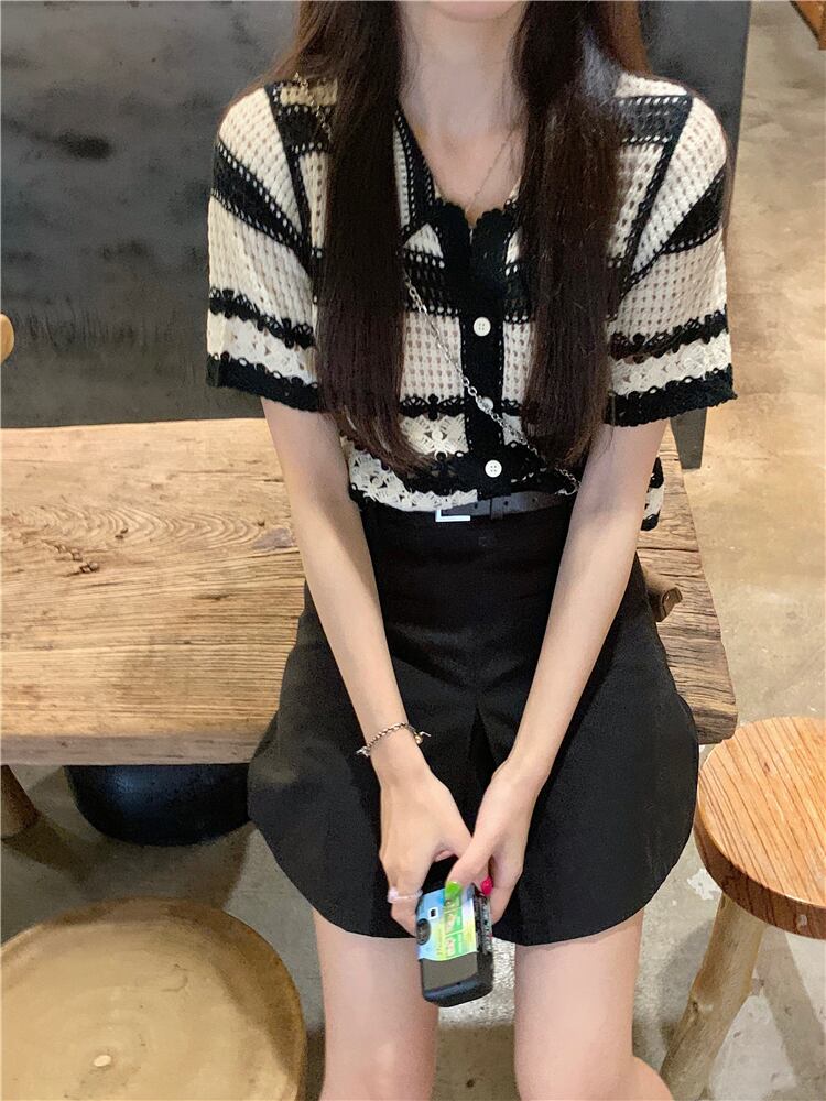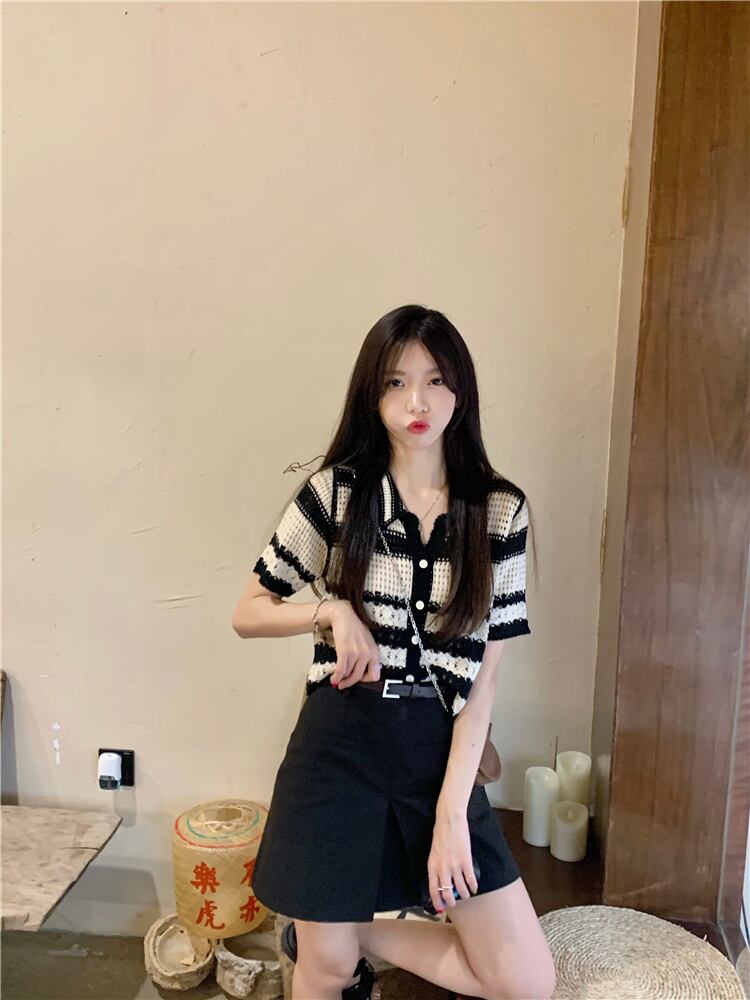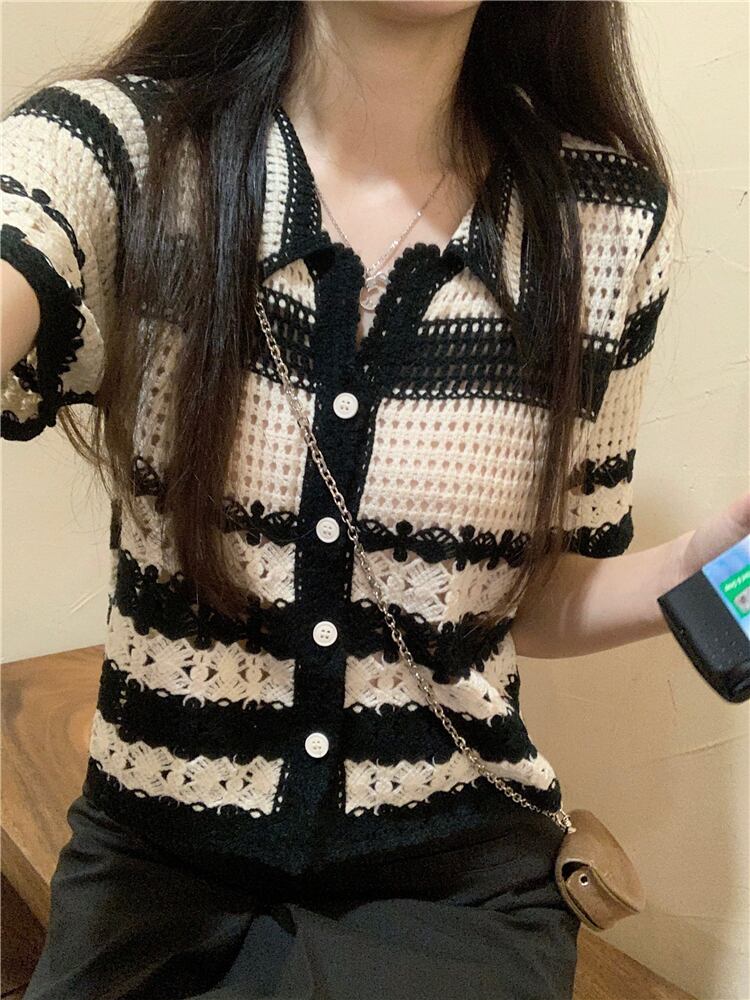 スタンダードストライプショートニットセーター サマーFlowerデザイン トップス レトロ 夏物 フラワーデザイン s576120672036876