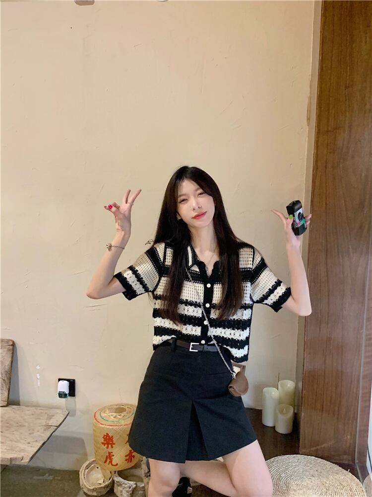 色:ストライプdトップ,ブラックスカート