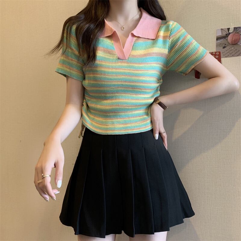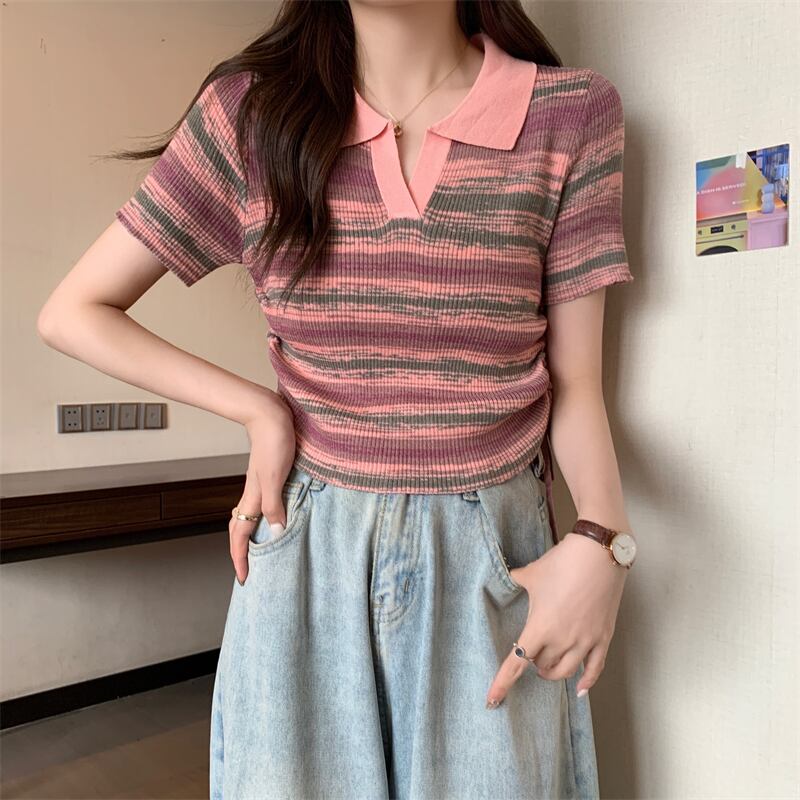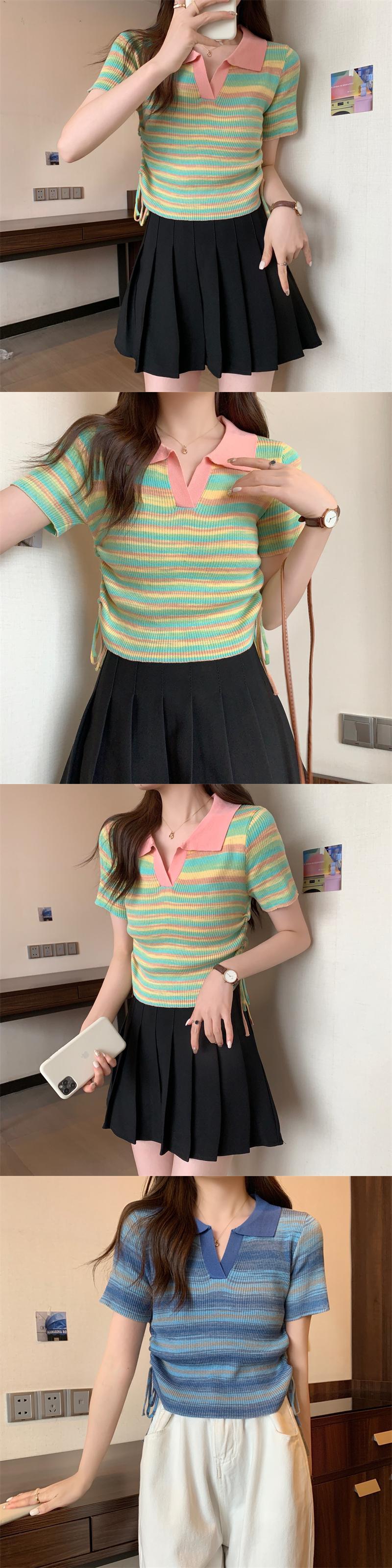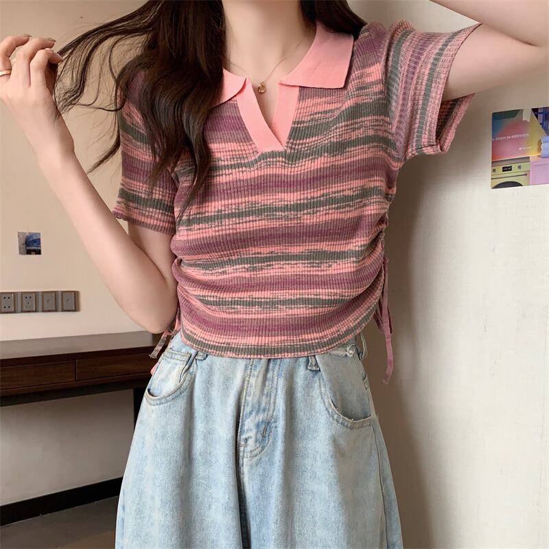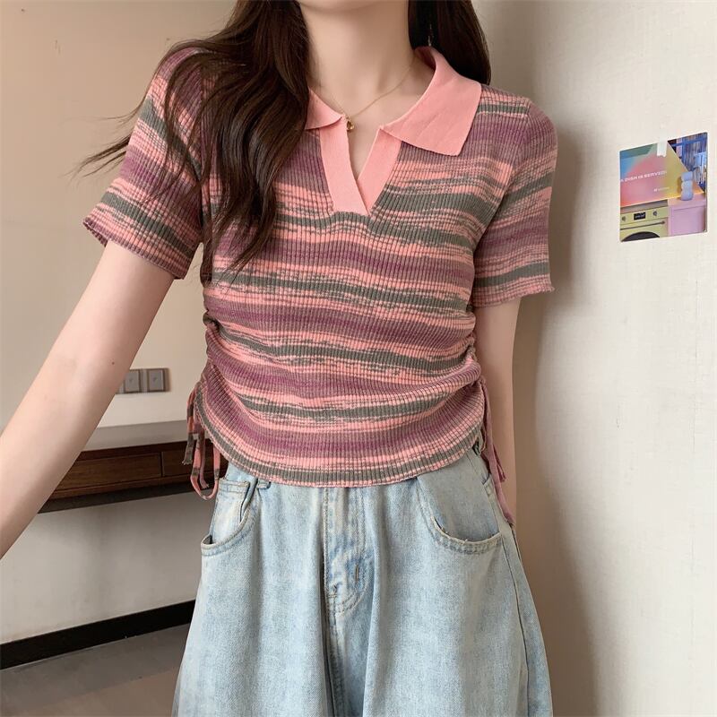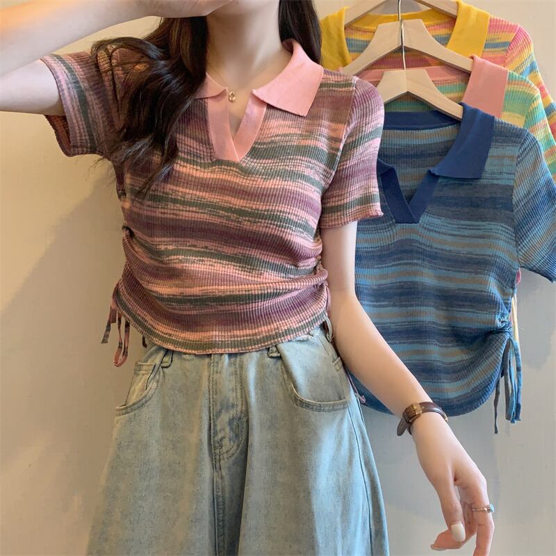 カラーストライプショートTシャツ サマーギャザートップス 夏物 s576132894608156