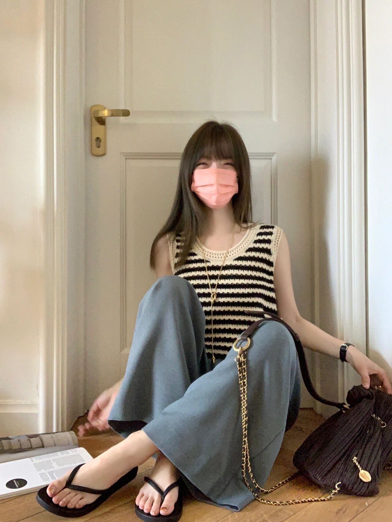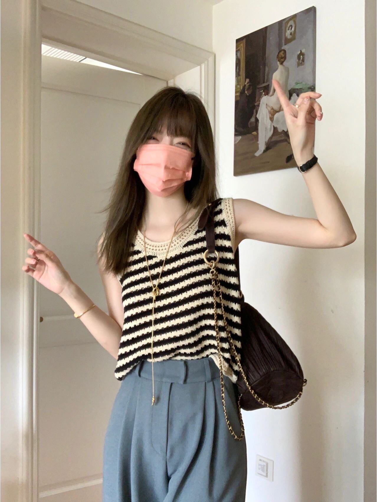 ストライプノースリーブニットセーター サマースタンダードスタイルショートトップス レトロ 夏物 s576161399381616