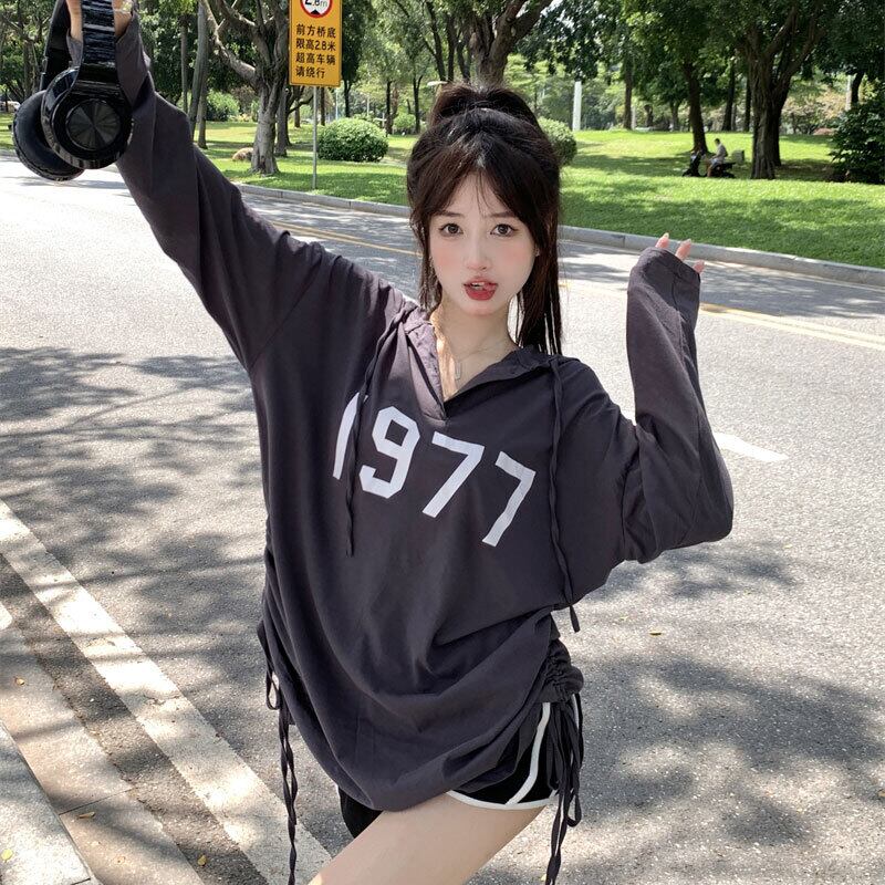 サマープリント長袖スリーブTシャツ レディースルーズスリムフィットギャザーフードトップス 薄手 ロング 夏物 s576177720485058