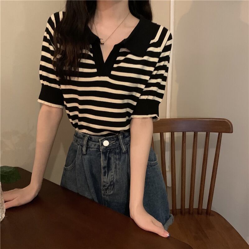 カラーストライプニットセーター トップス サマー薄手Tシャツ 夏物 s576128598047755