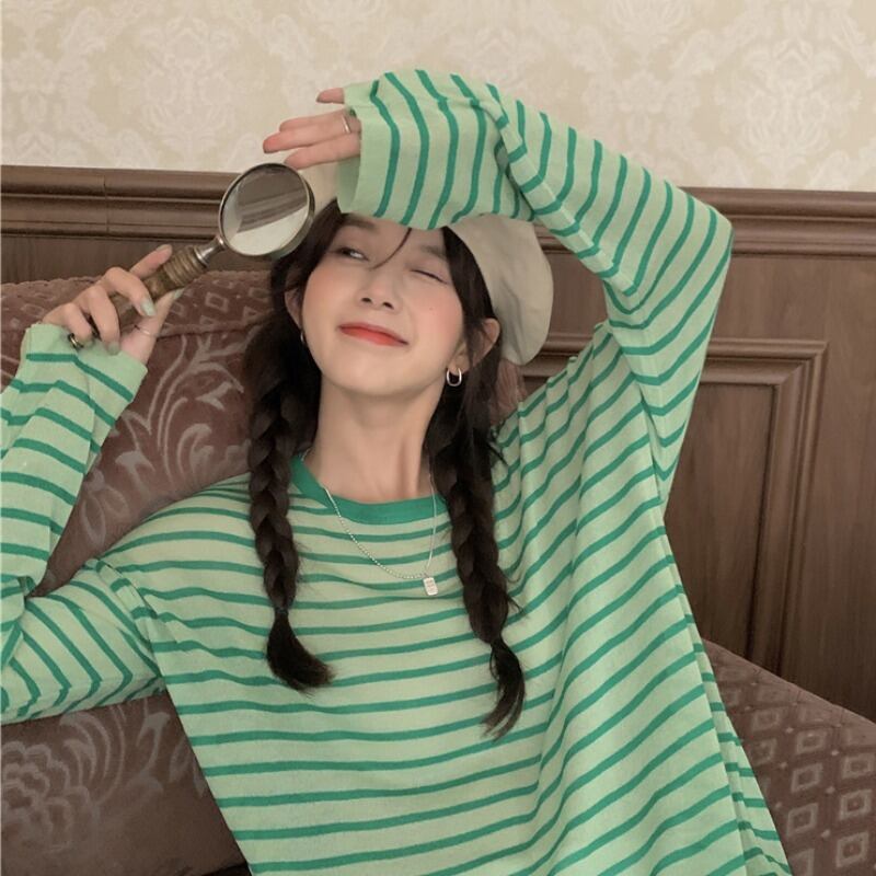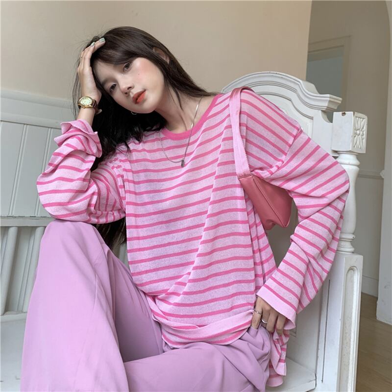 ストライプサマールーズ薄手セーター シャツ カジュアルトップス ロング 夏物 s576170322503533