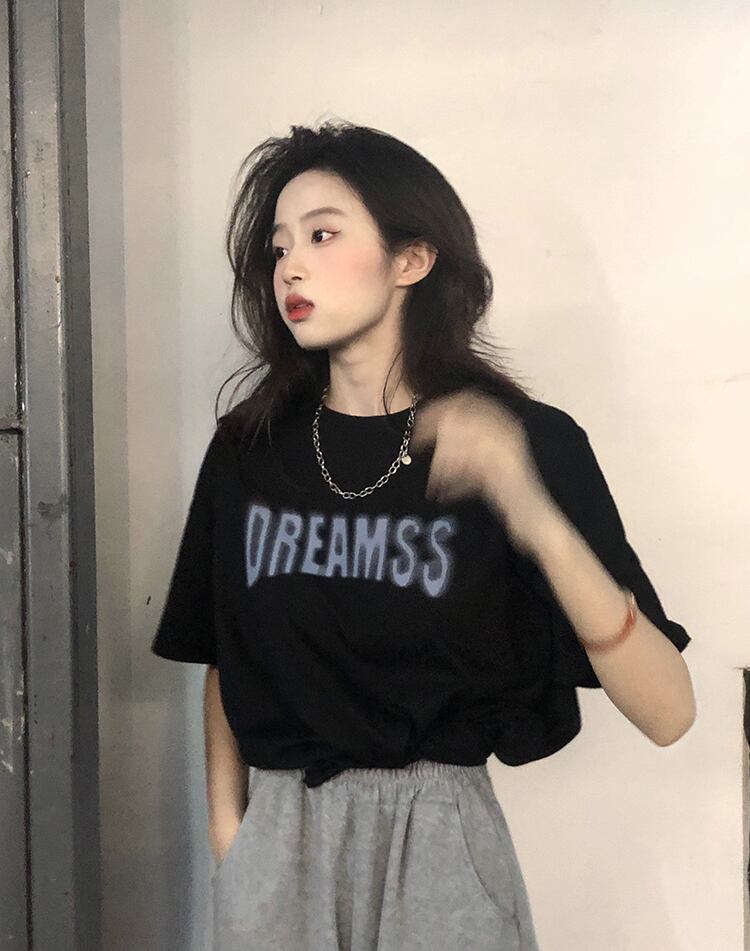 Tシャツ サマープリントブラックルーズトップス コットン 夏物 s576176156375760