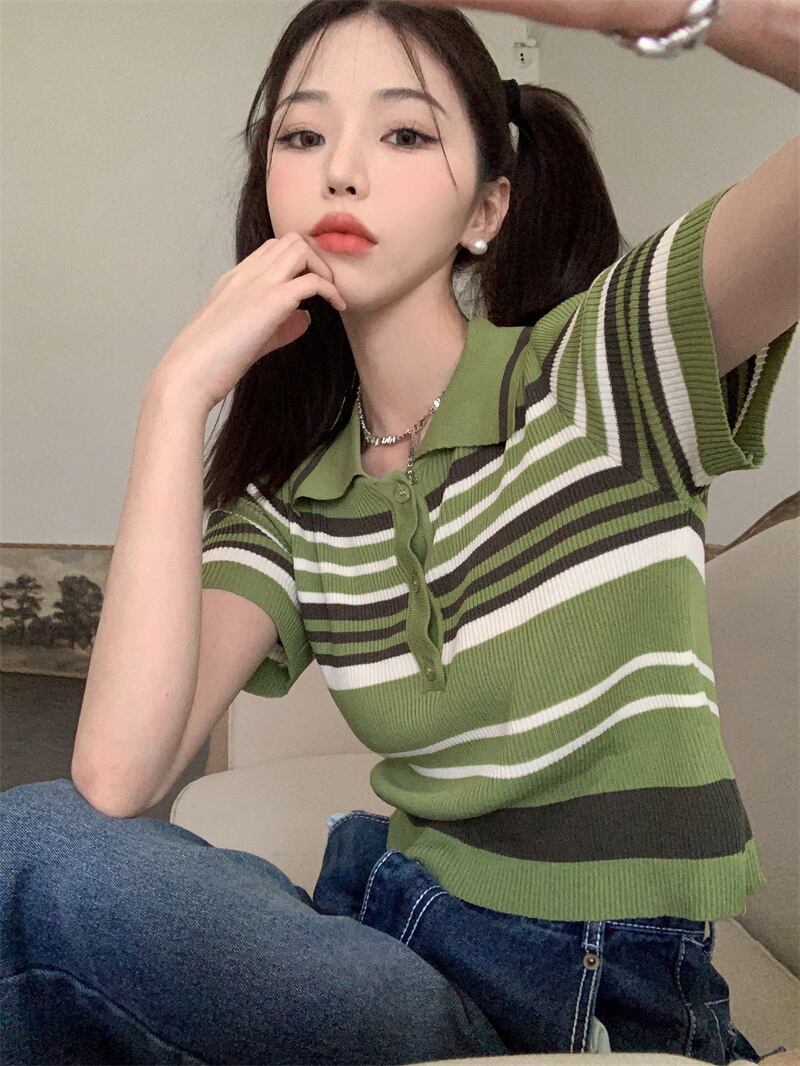 カラーストライプTシャツ サマーショートスリムニットトップス 夏物 s576189183904890