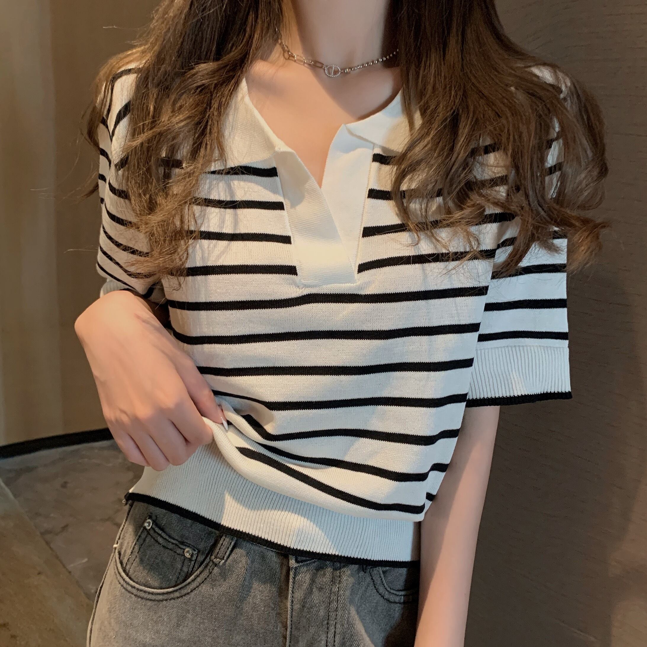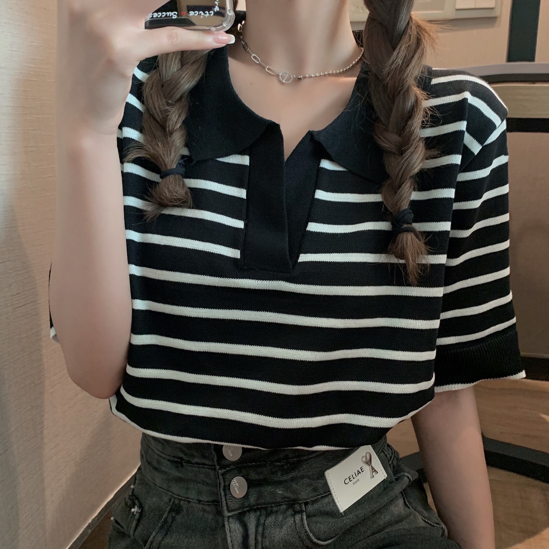ストライプカラーニットTシャツ サマートップス 夏物 シルク s576179371796433
