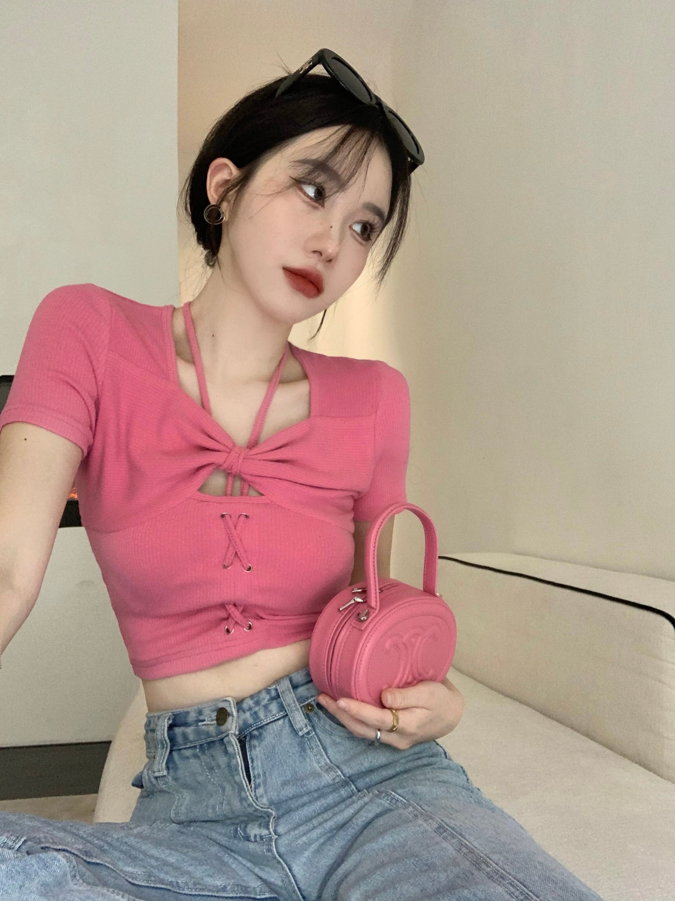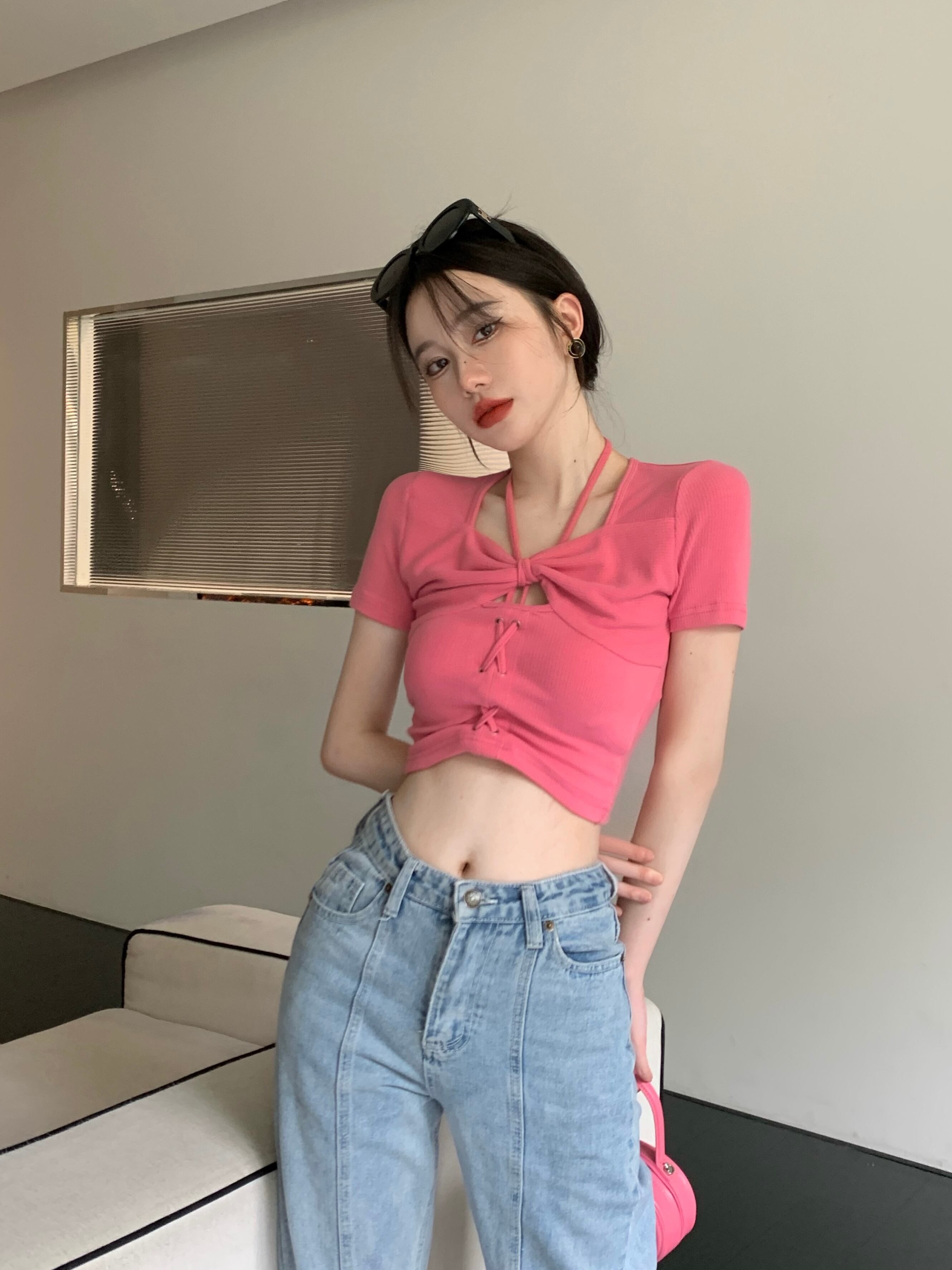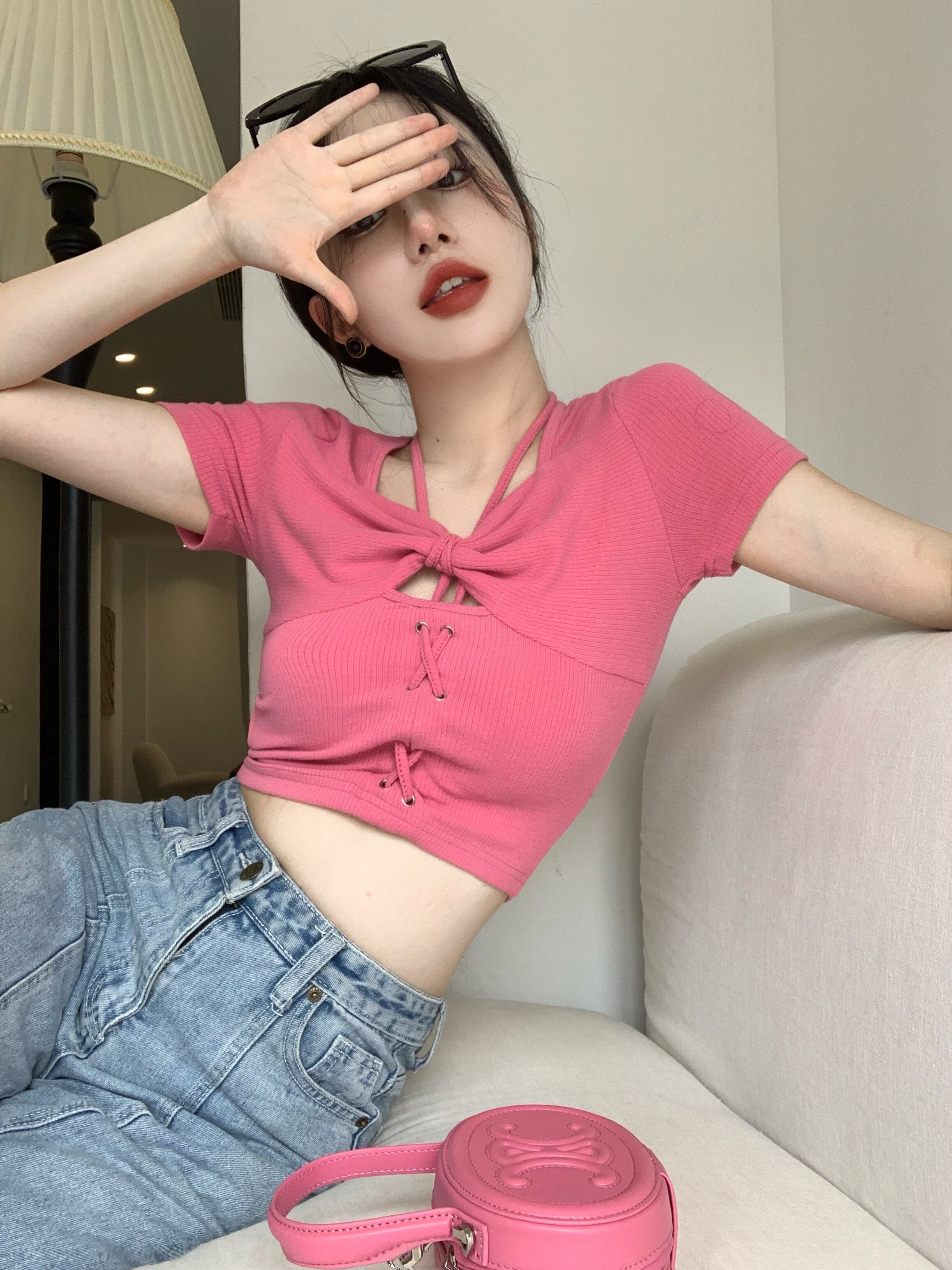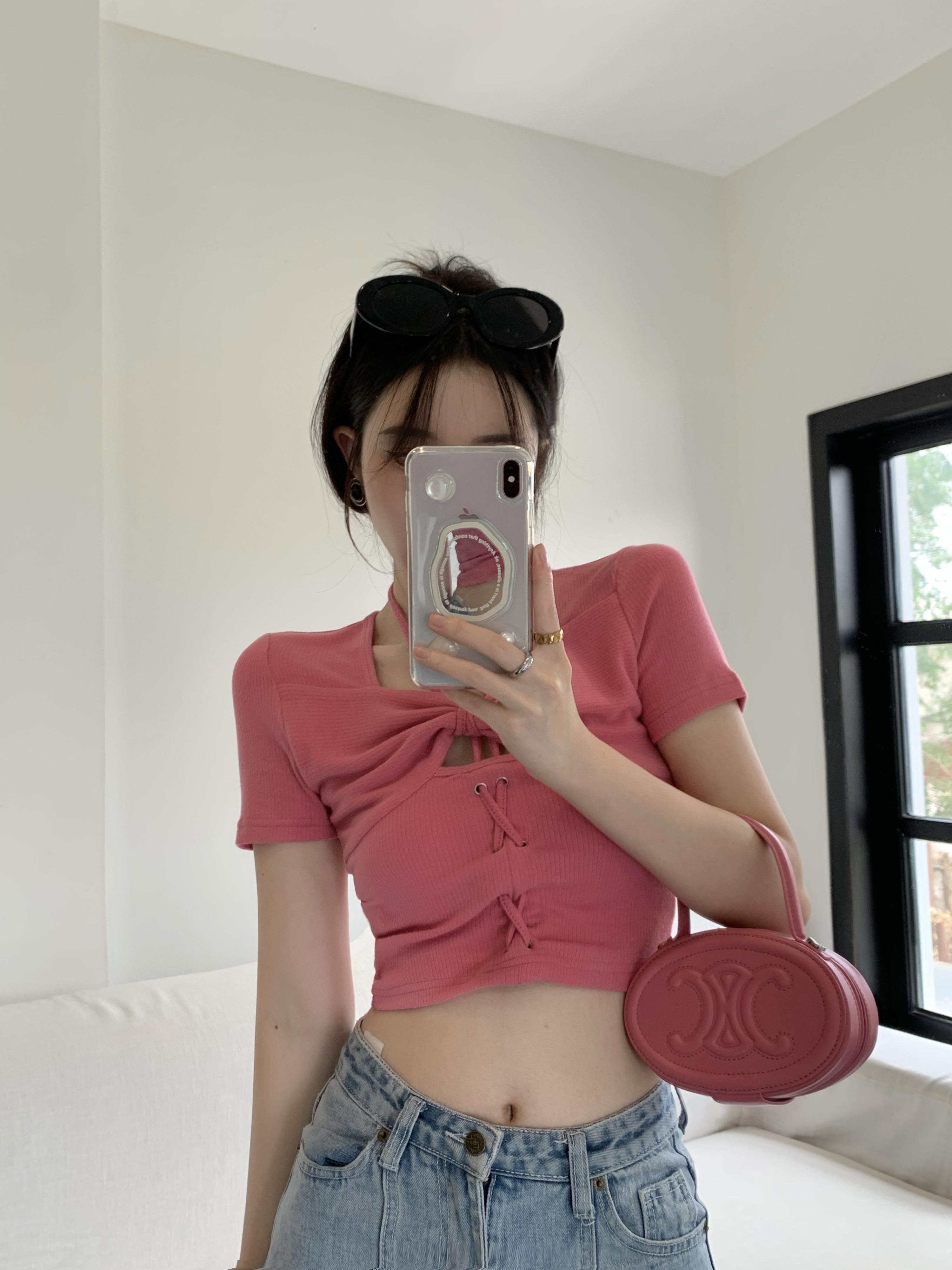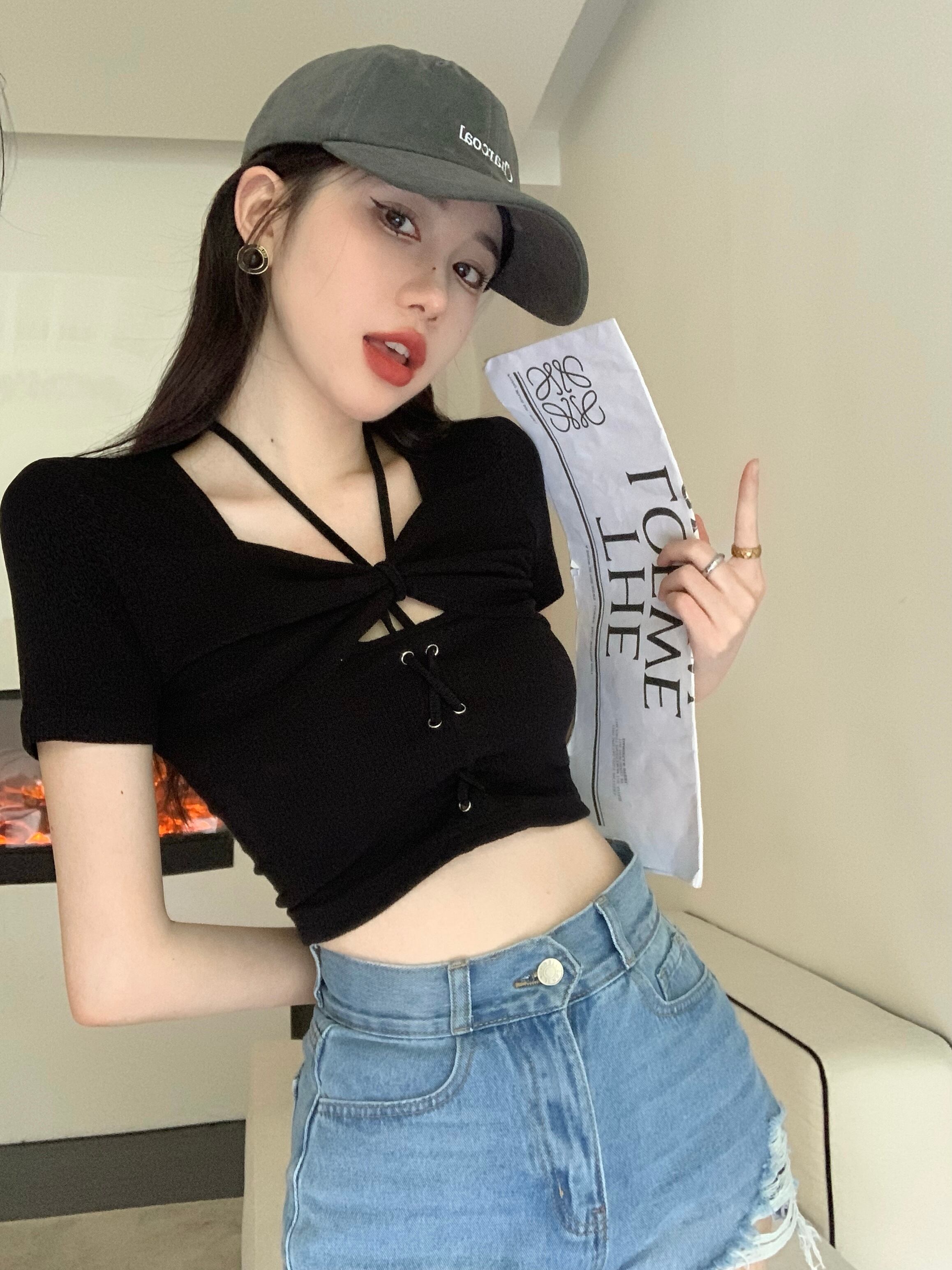 ホルタースリムショートニットTシャツ サマーブラック薄手ハイウェストウェストクロップトップ トップス 夏物 s576115961744395