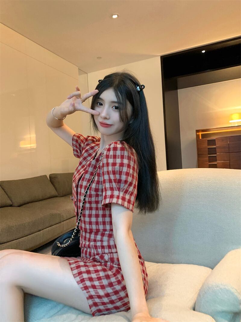 スタイルレッド格子柄スカート サマーAラインハイウェストウェストショート 大人ガーリー スウィート キュート カジュアル 夏物 s576180292473304
