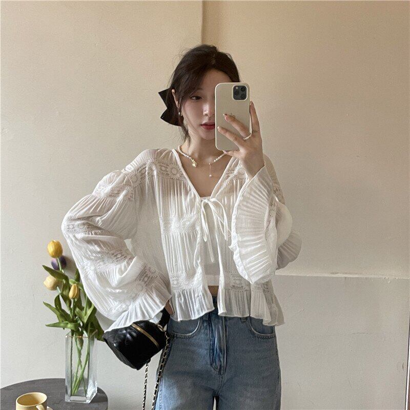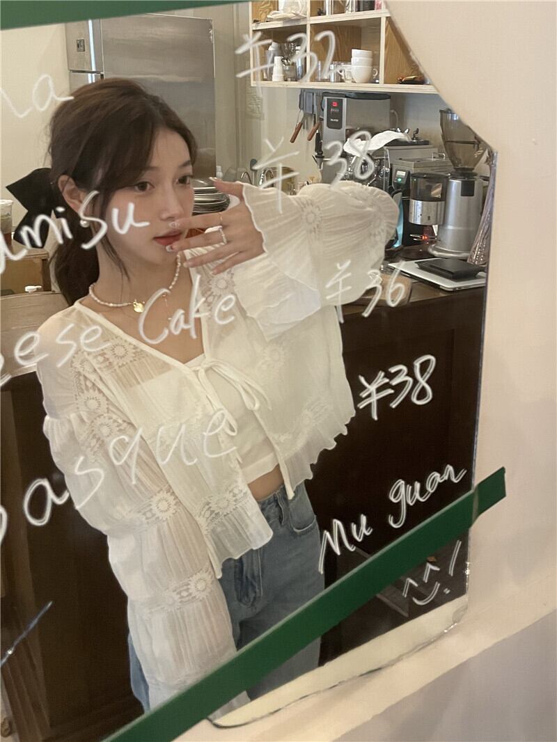 Vネックショートトップス サマー薄手ホワイトシャツ ジャケット 大人ガーリー スウィート キュート カジュアル 夏物 s576167356690266