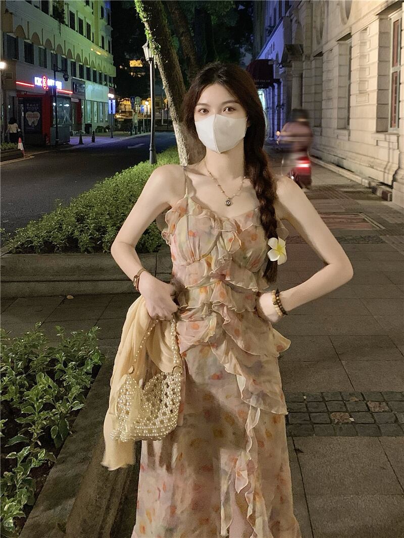 ドレス サマーノースリーブフローラルVネックシフォンスカート ロング 夏物 花柄 ピュア s576136413063196