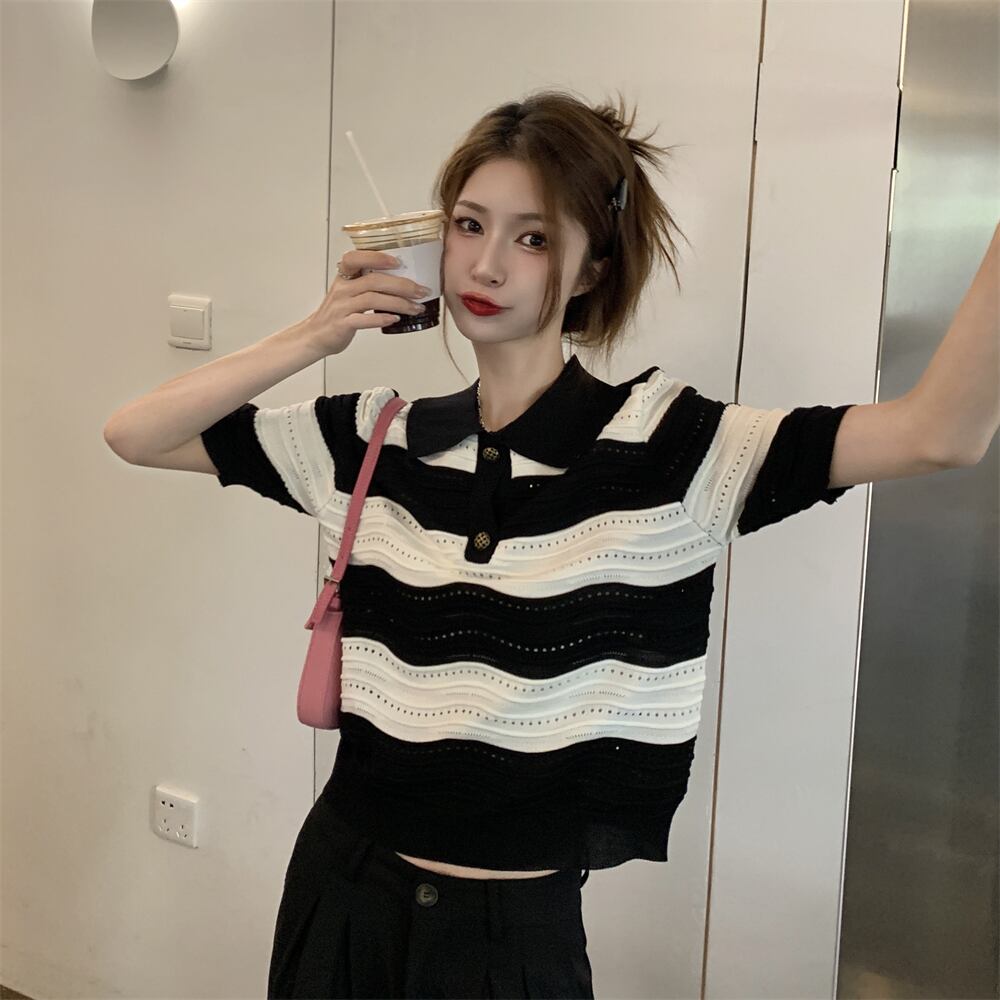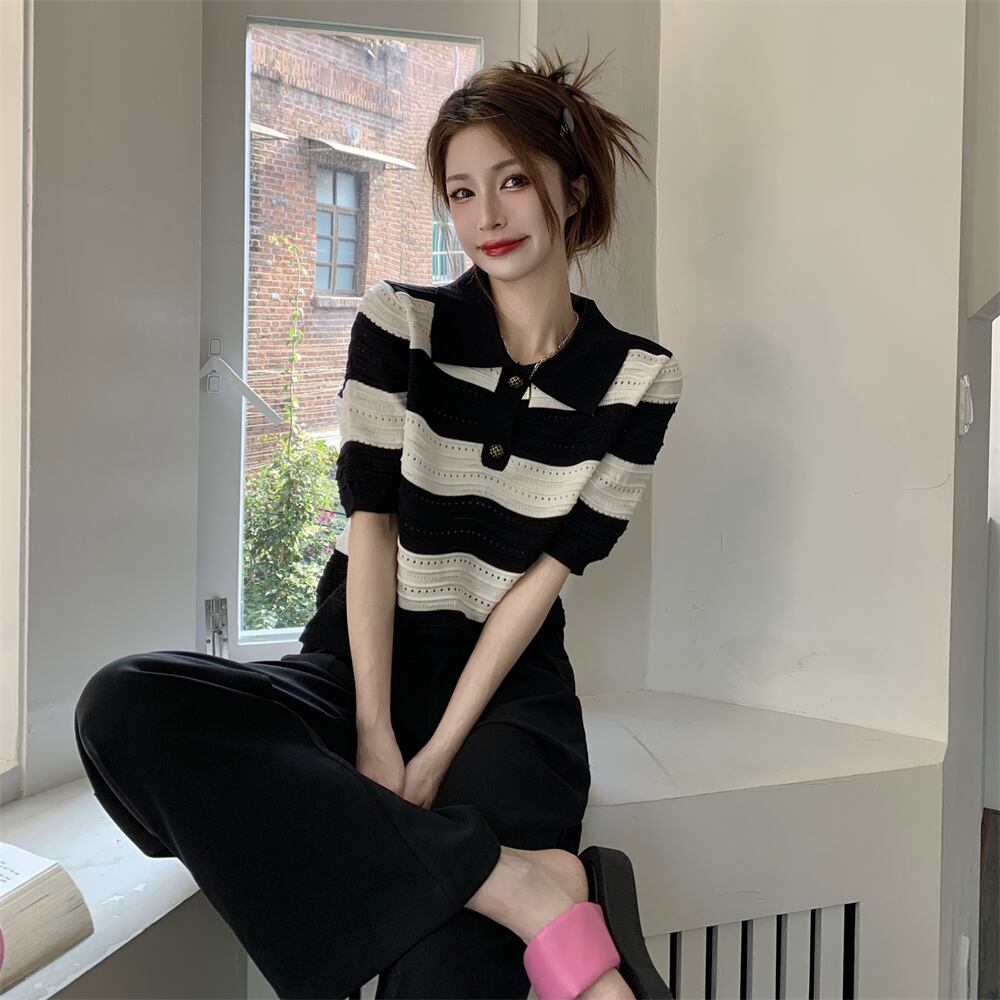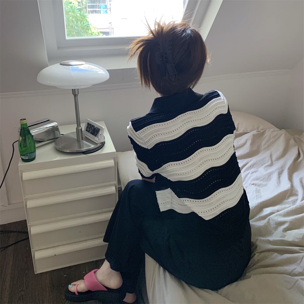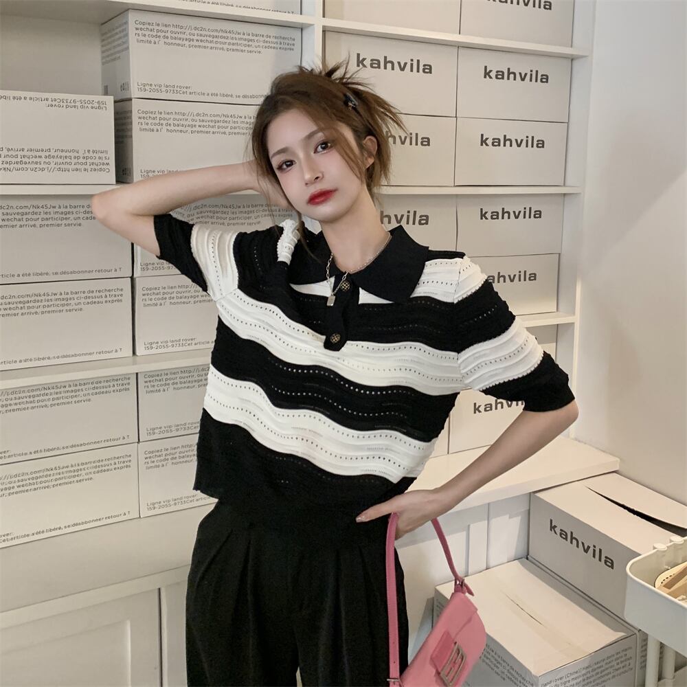 ブラックホワイトセーター カラーストライプTシャツ サマートップス 夏物 s576172461763807