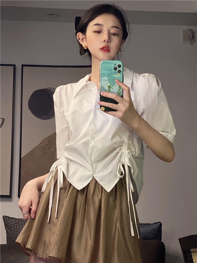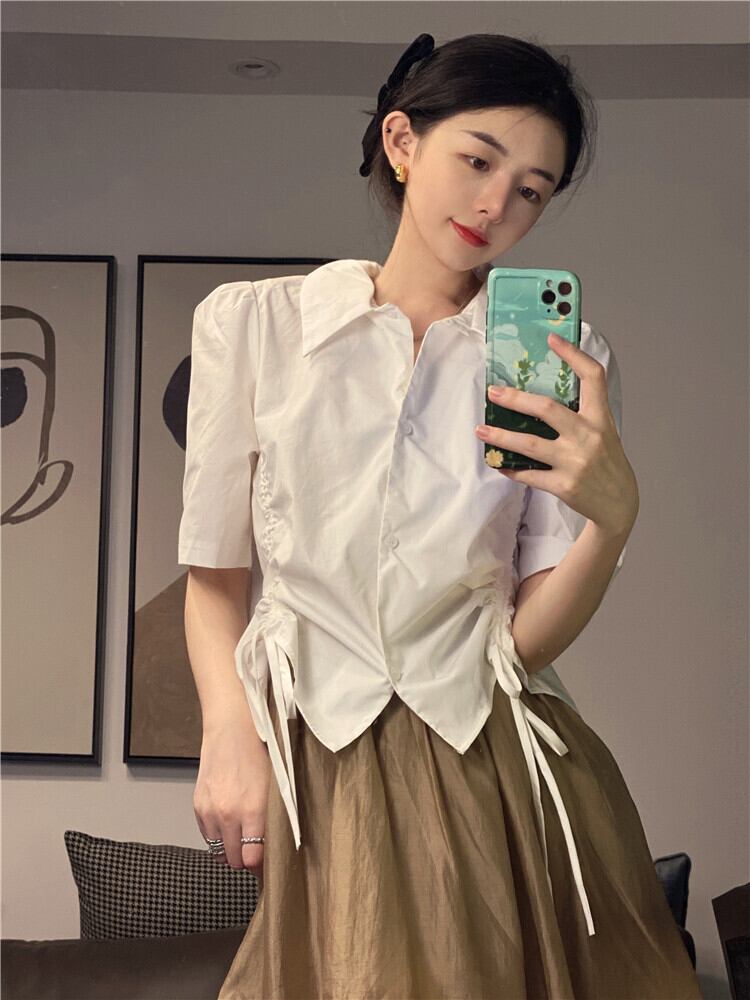 ショートシャツ サマートップス ギャザーホワイト 大人ガーリー スウィート キュート カジュアル 夏物 s576164862510066