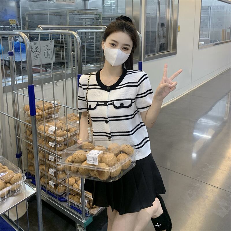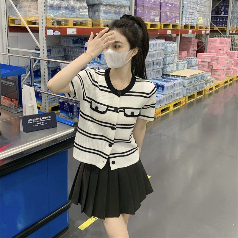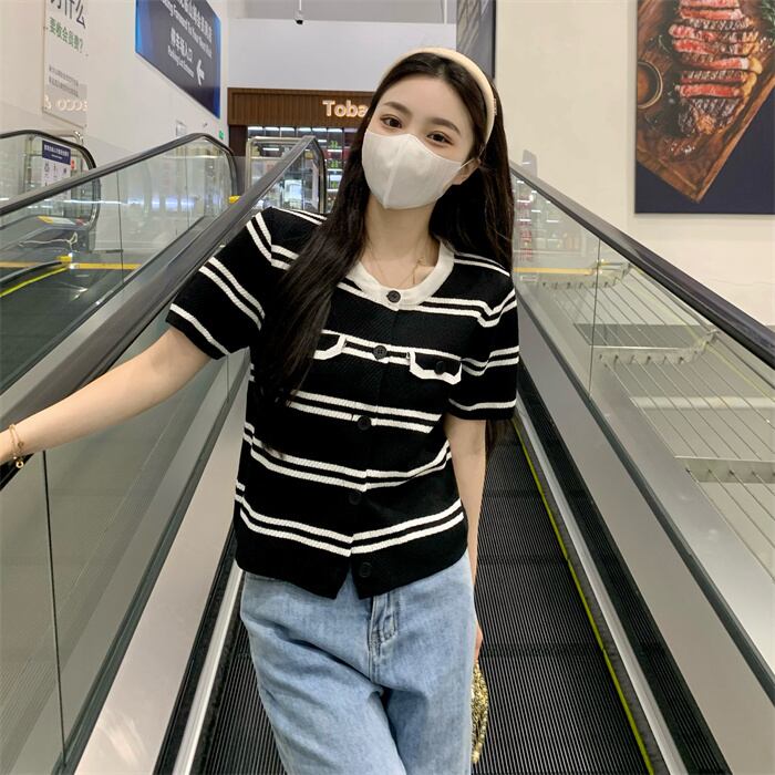 ニットカーディガン薄手ストライプTシャツ スリムVネックトップス サマー 夏物 シルク s576164650094200