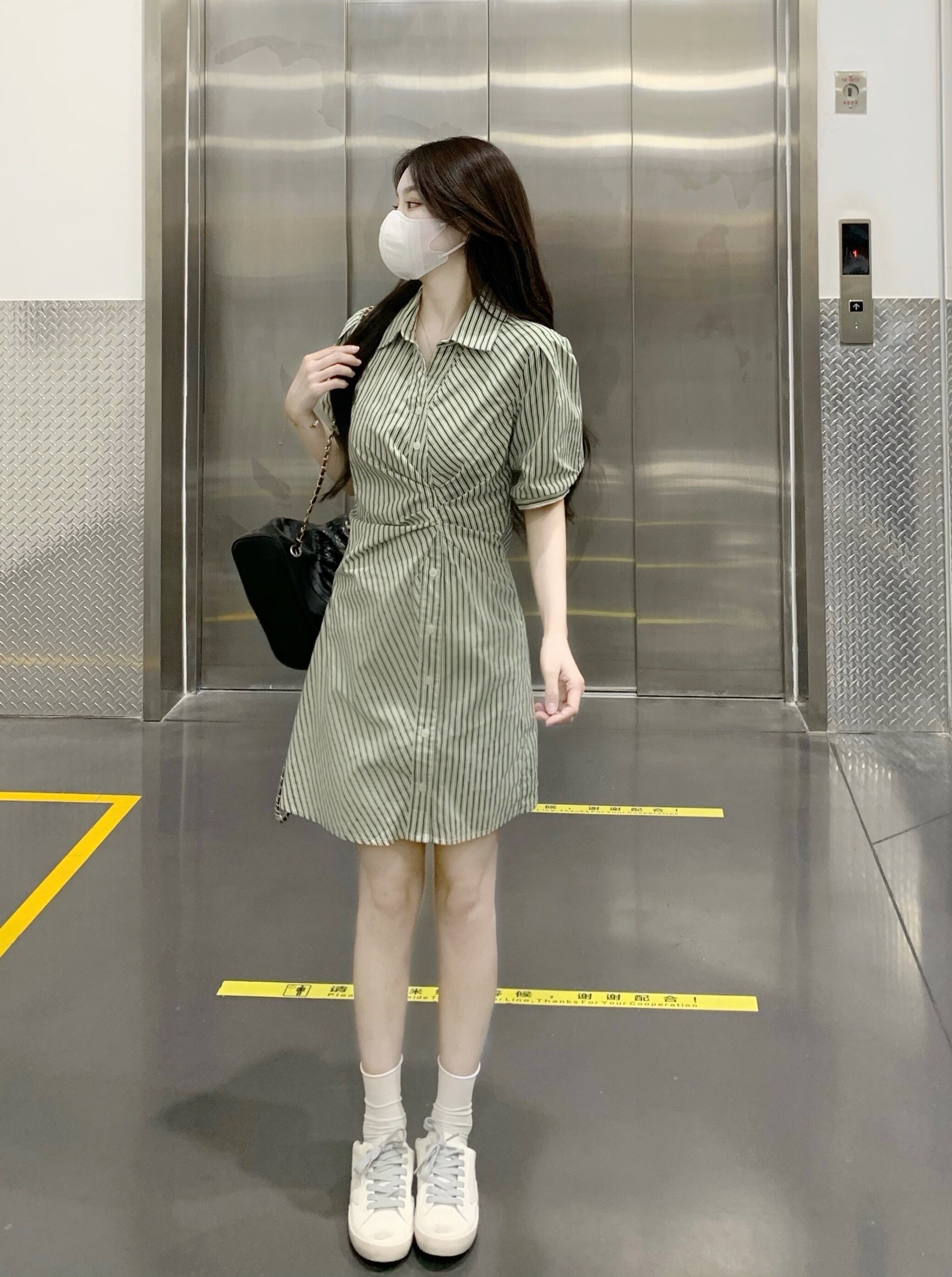 グリーンストライプシャツ ドレス ウェストスリムカラースカート レディース s576167121261577