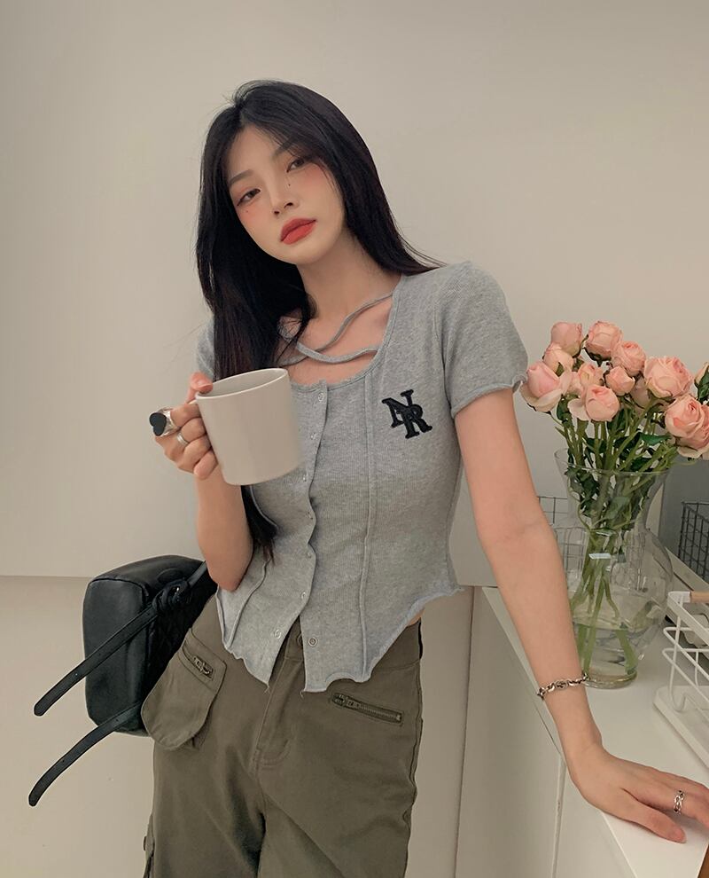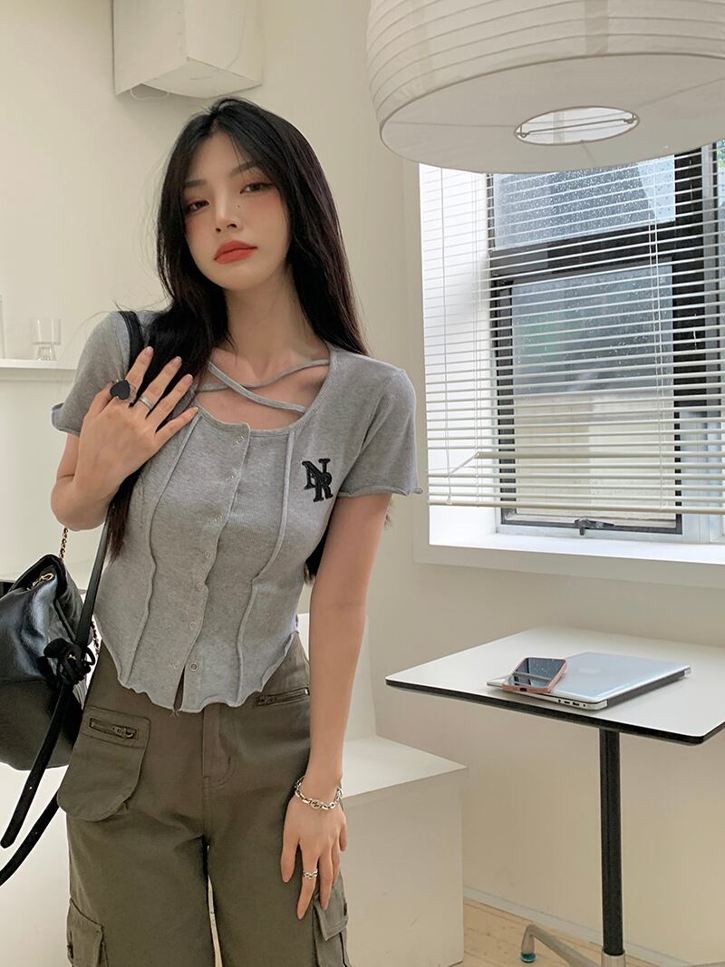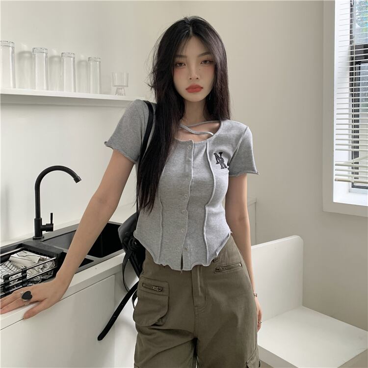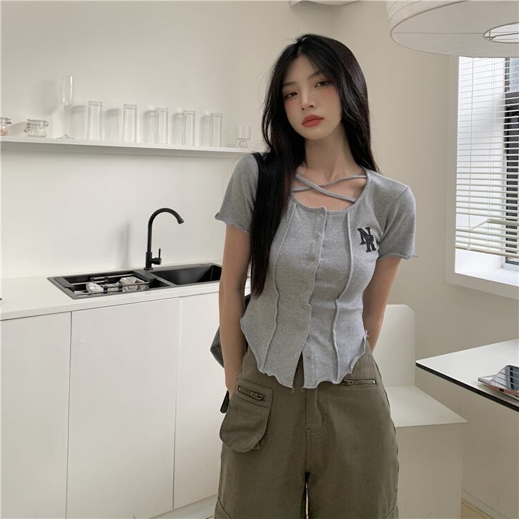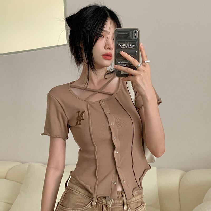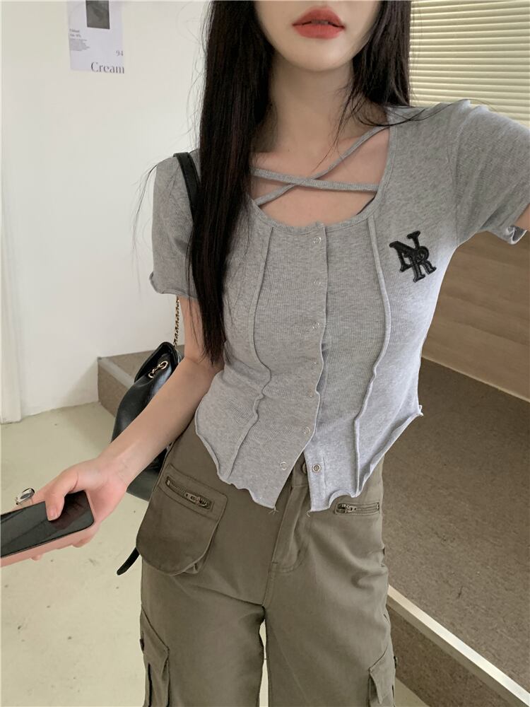 クロスラウンドネックショートTシャツ サマートップス 夏物 Oネック s576184472471435
