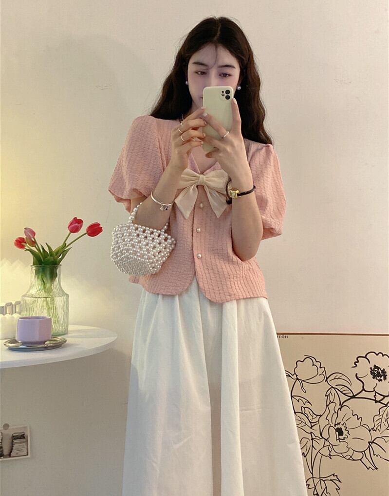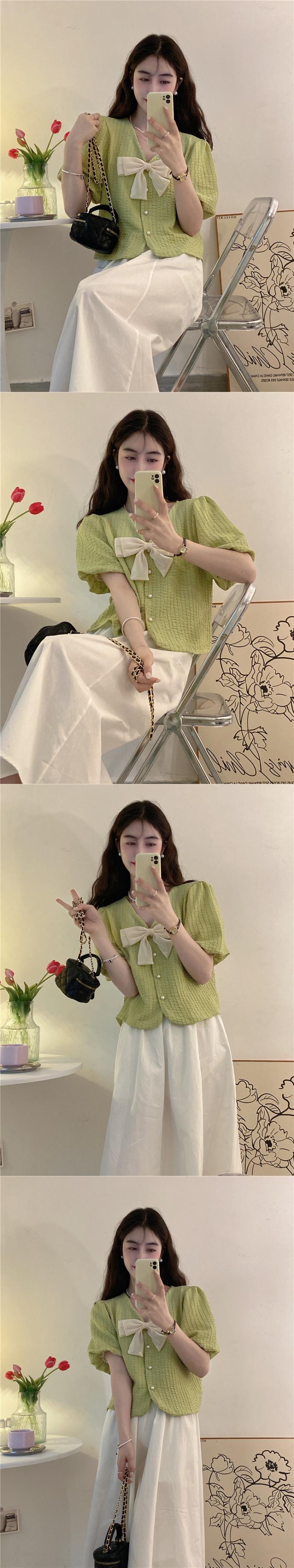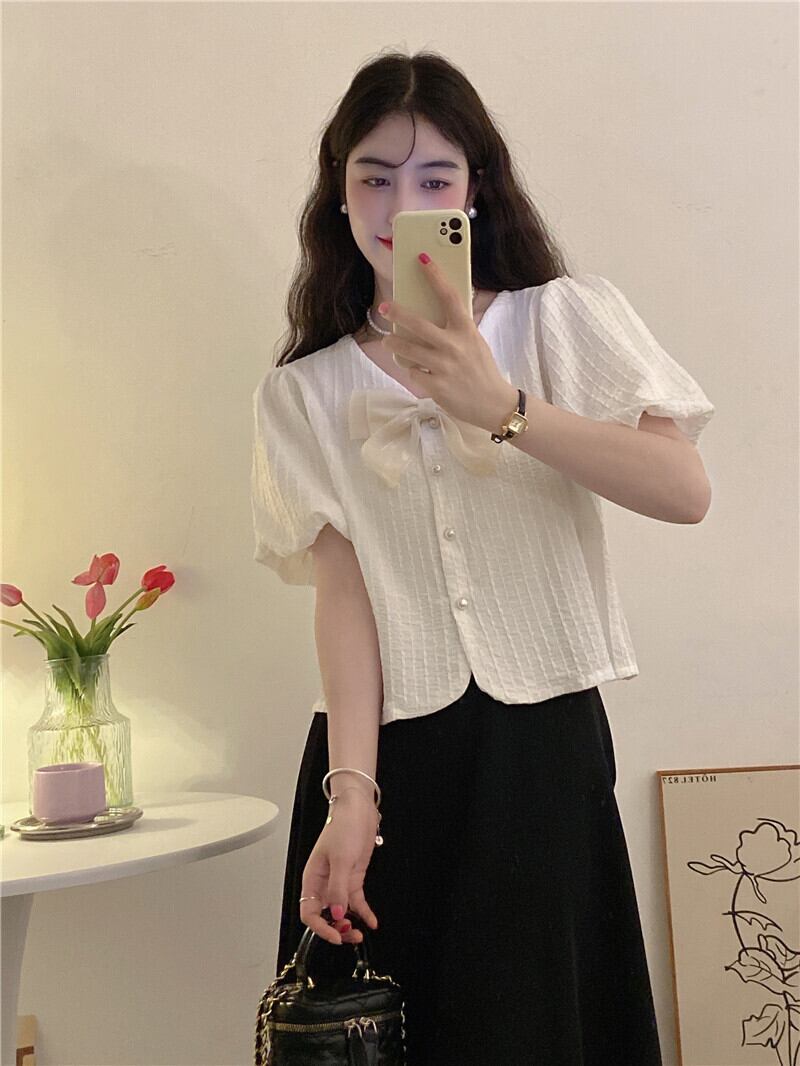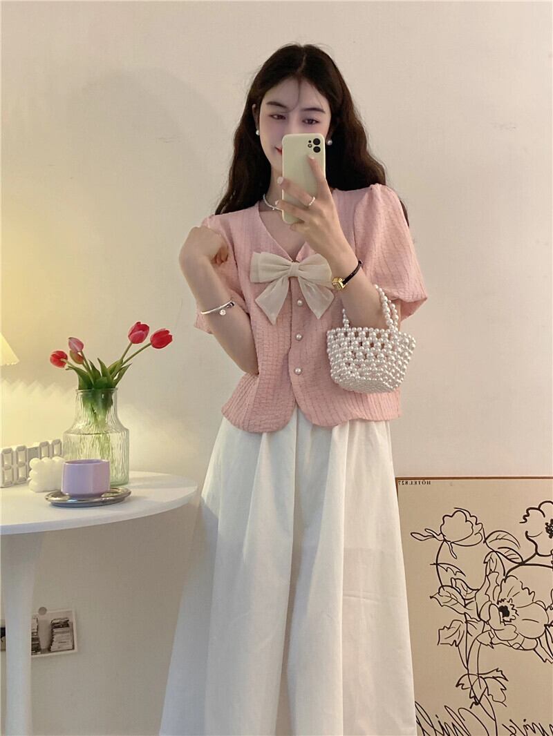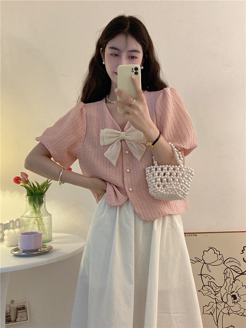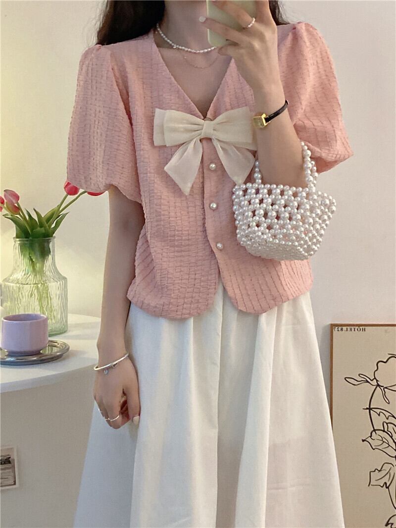 Vネックリボンショートスリーブシャツ サマートップス 大人ガーリー スウィート キュート カジュアル 夏物 s576128809761017