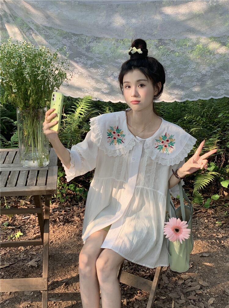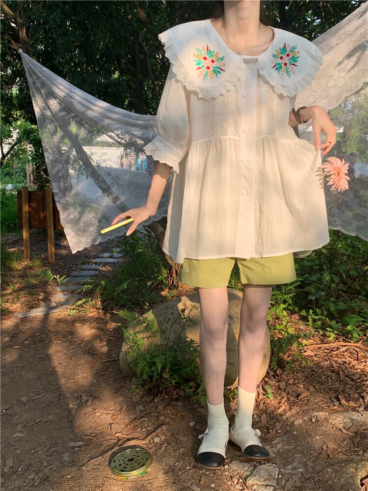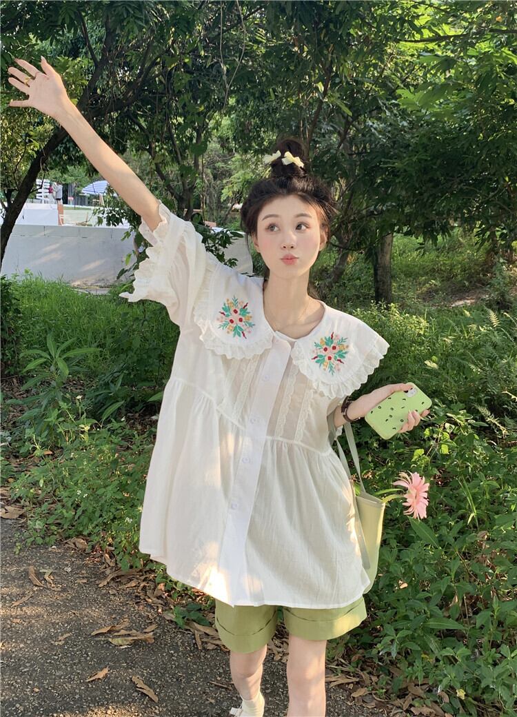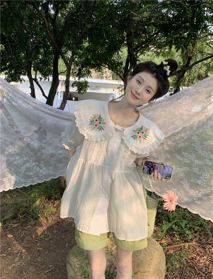 カラーレースシャツ サマールーズトップス レッド コットン 刺繍 夏物 s576130952564392