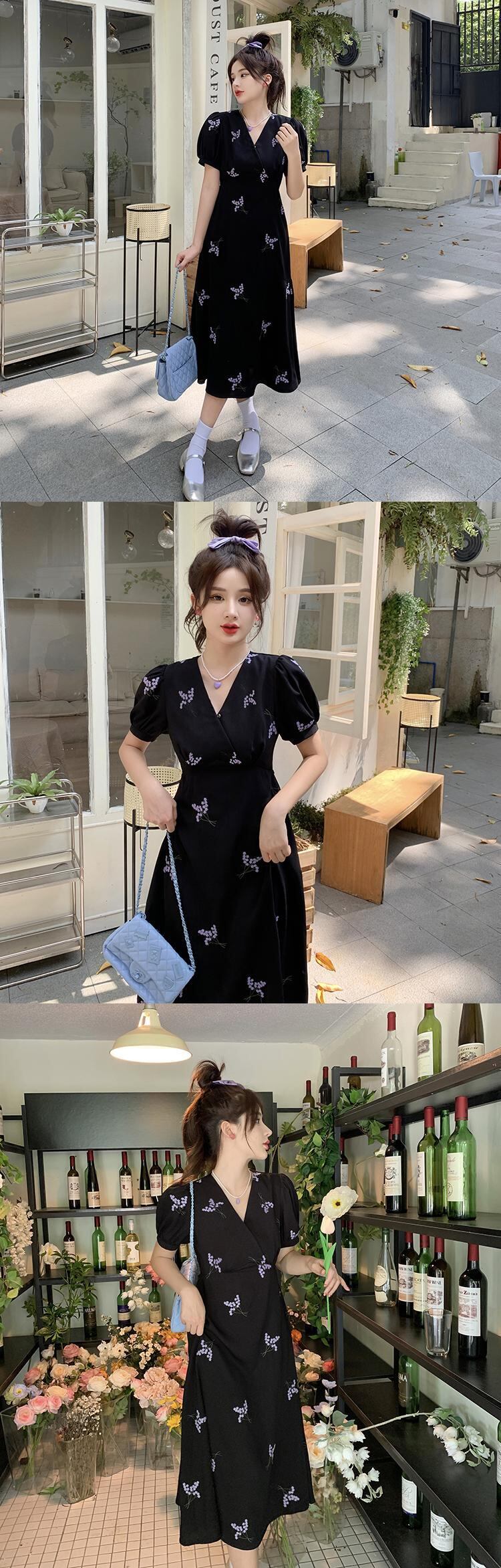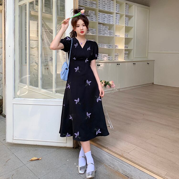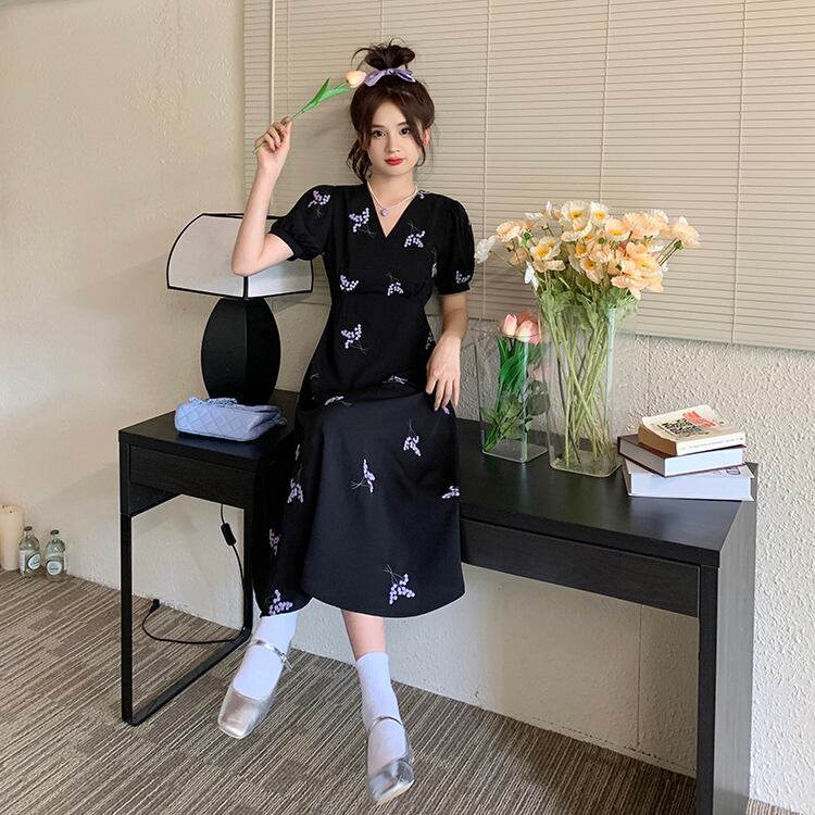 ブラックVネックフローラルドレス スプリングサマースタンダードウェストスリムロングスカート レトロ 春物 夏物 花柄 s576145477878963
