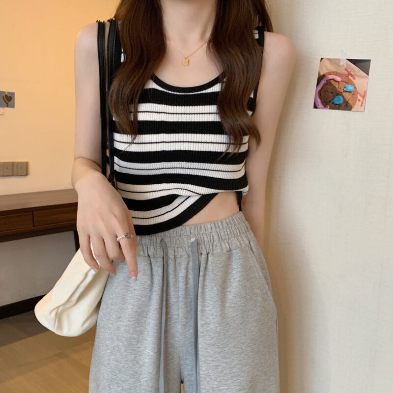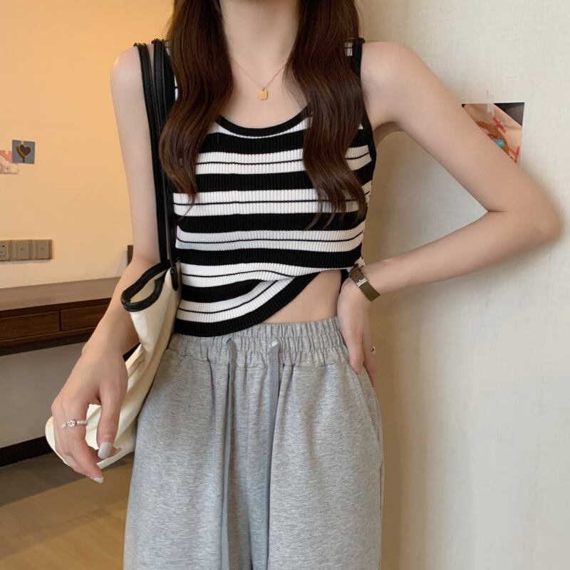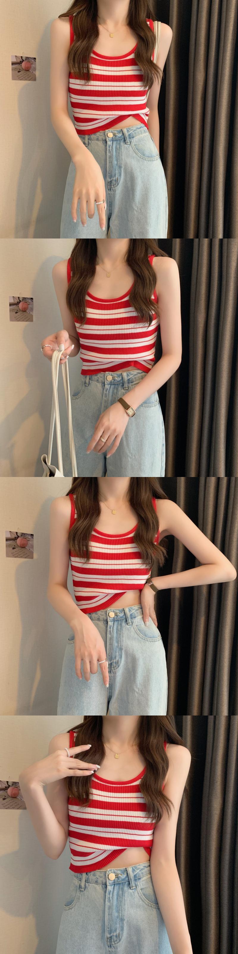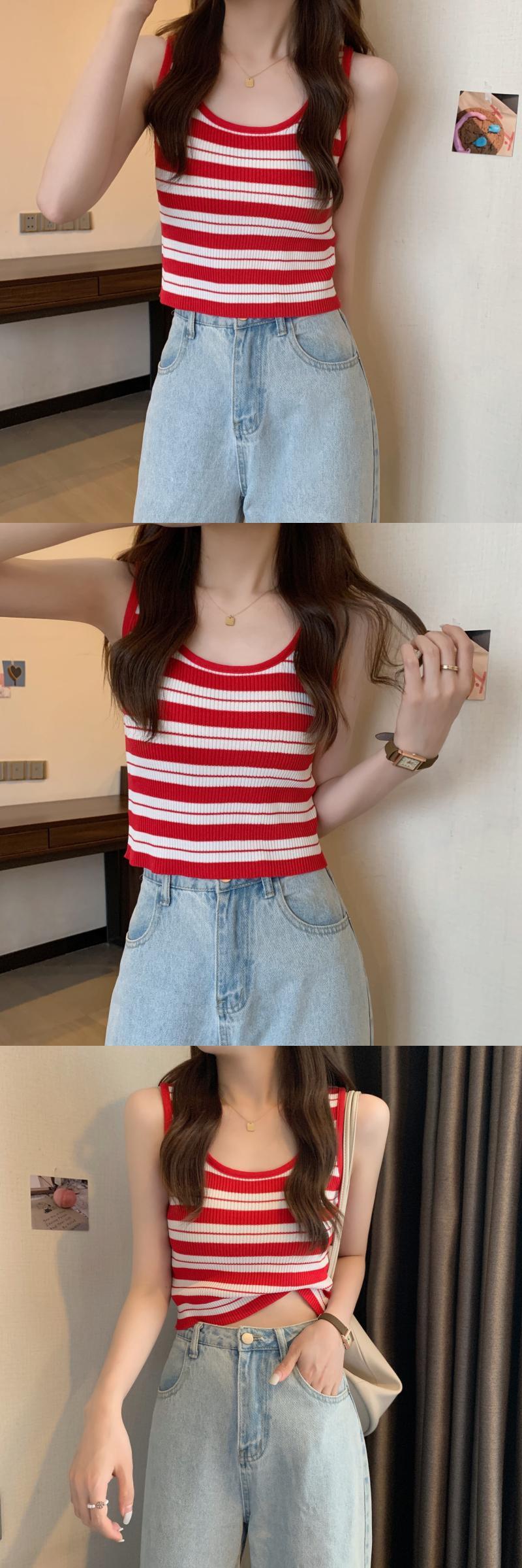 ストライプニットサマースタイルスリムフィットノースリーブショートトップス 夏物 s576116487884746