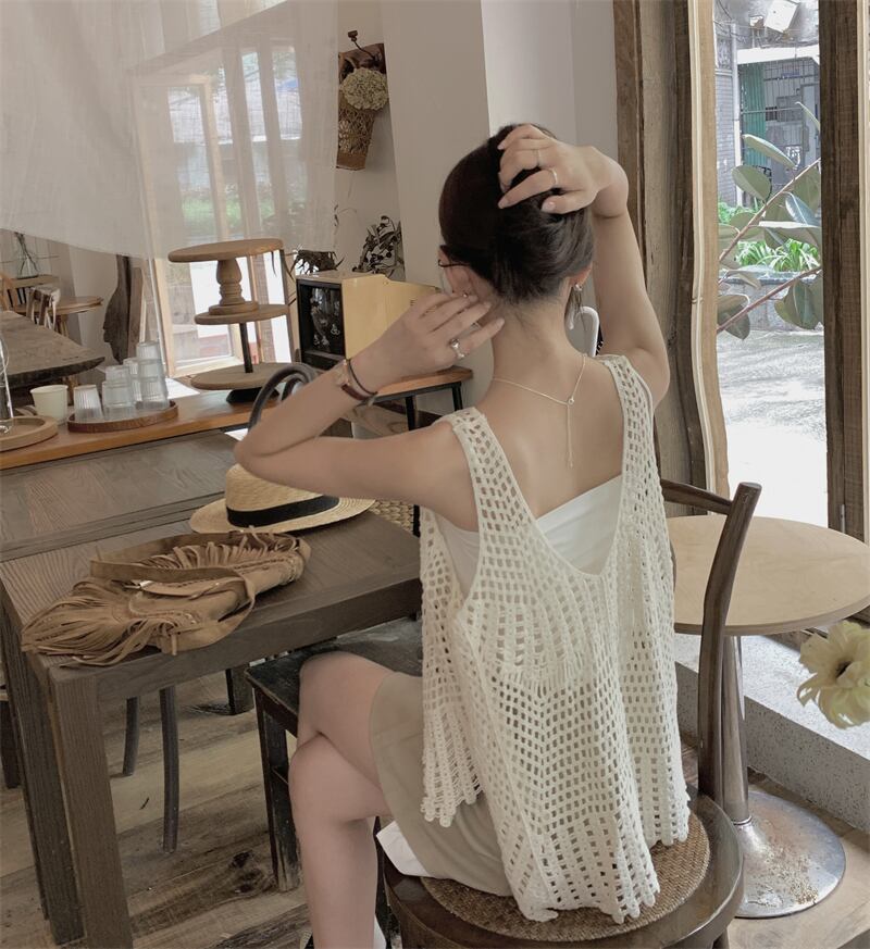 サマーレッドノースリーブVネックトップス 夏物 s576189595698210