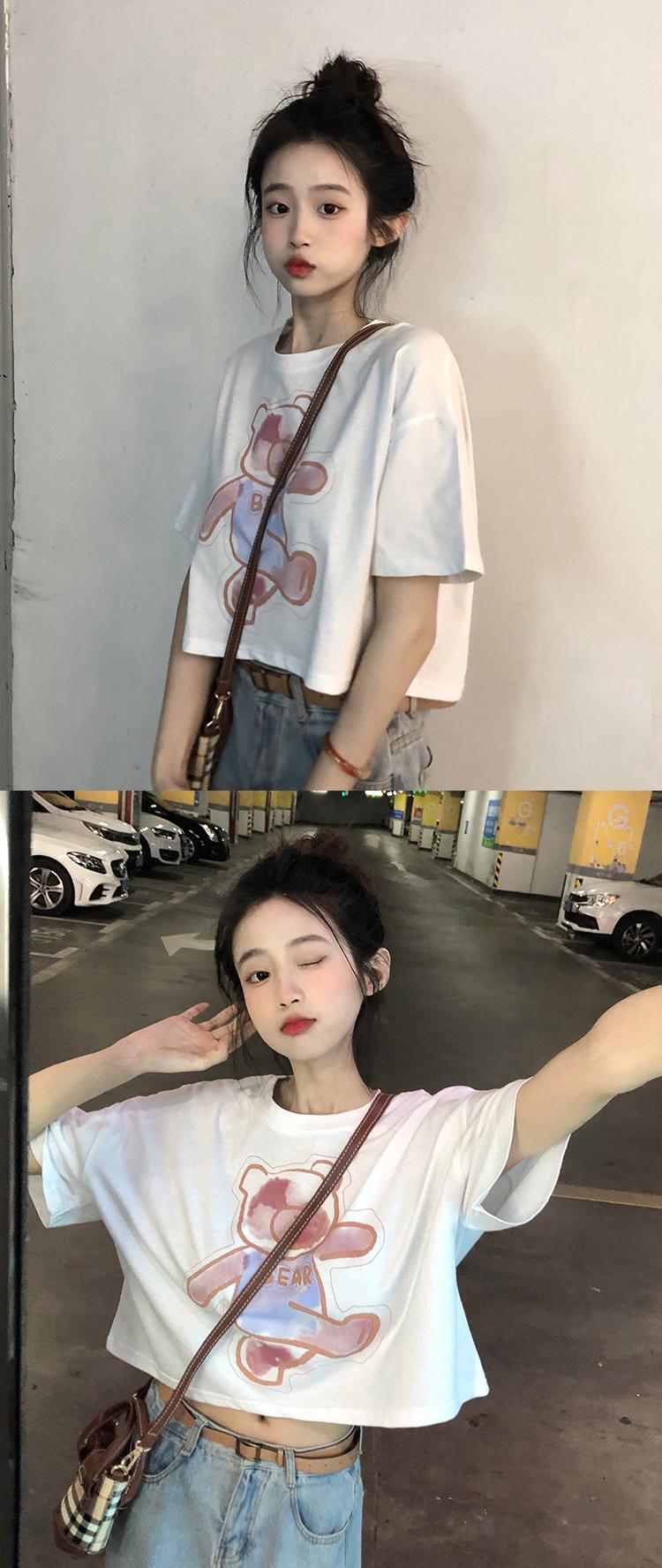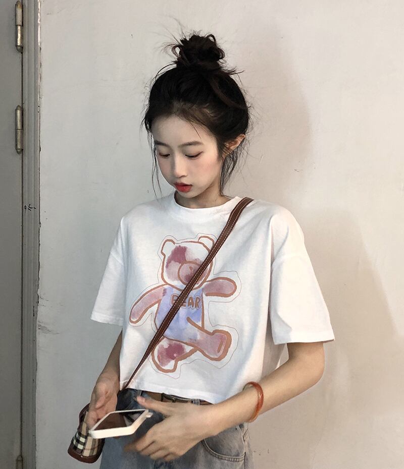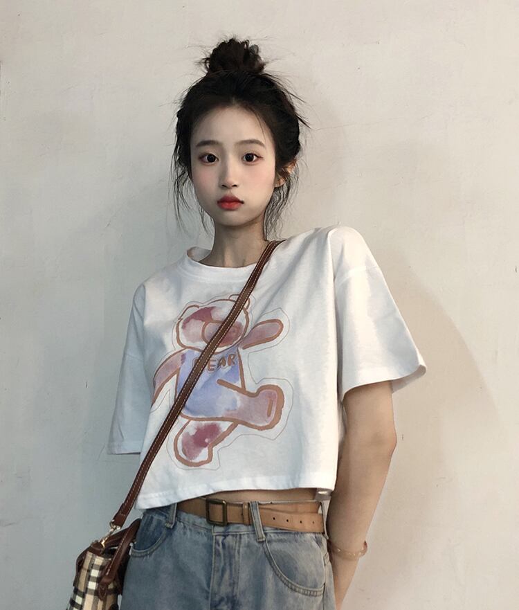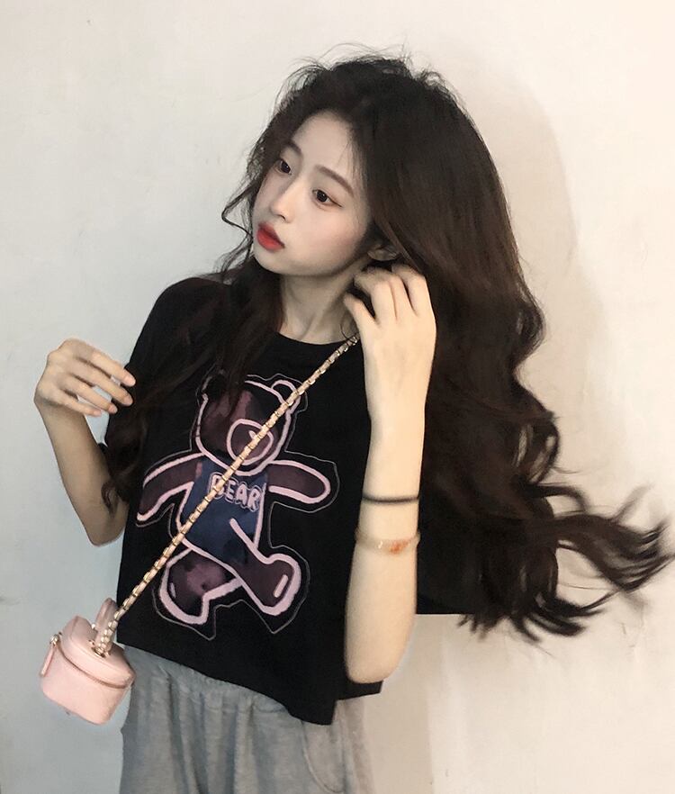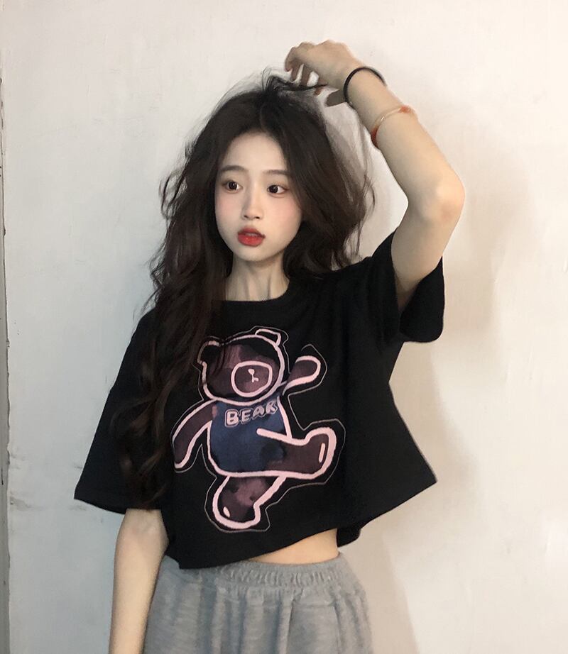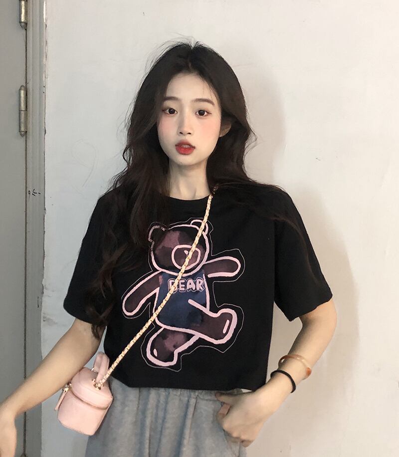ブラックルーズカジュアルショートトップス サマープリント柄Tシャツ コットン 夏物 s576150981249618