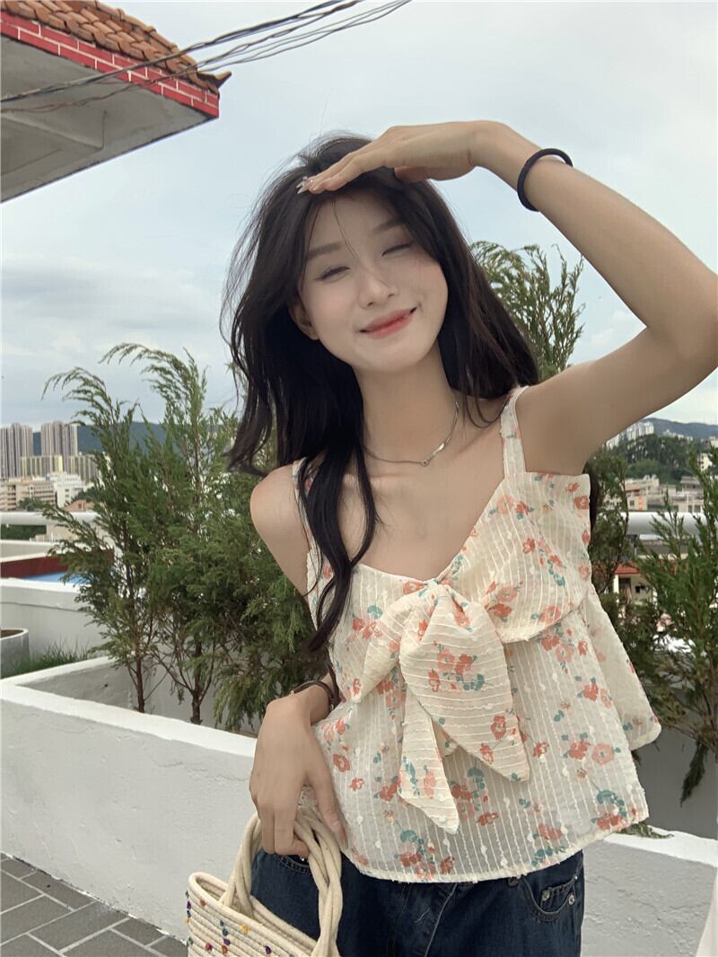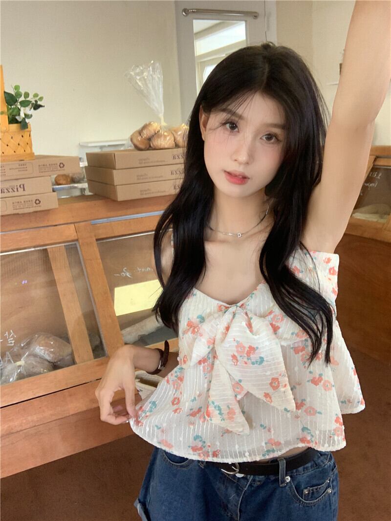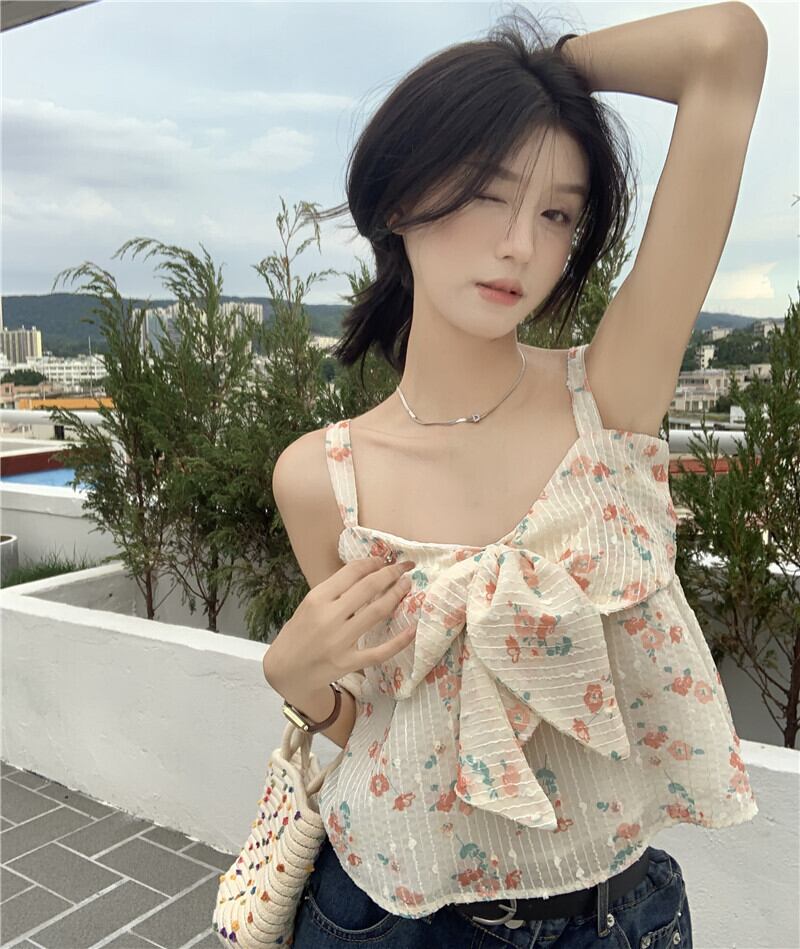 フローラルリボンシャツ サマーハイウェストウェストスリムトップス 大人ガーリー スウィート キュート カジュアル 夏物 花柄 s57612298766756