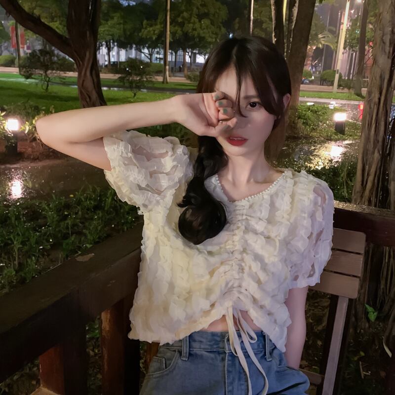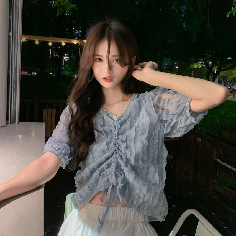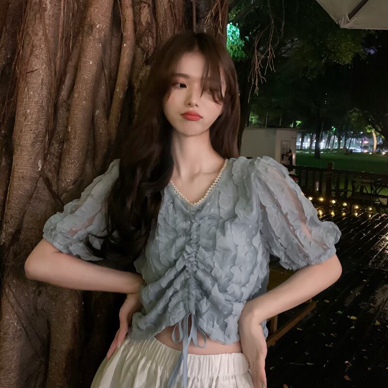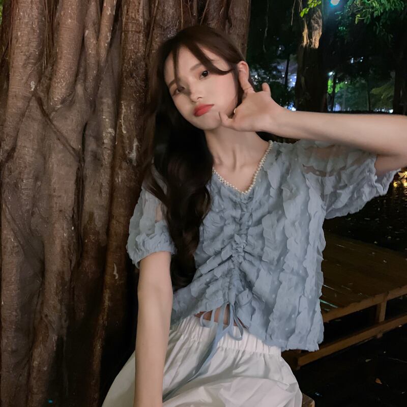 サマースリーブシャツ トップス ハイウェストウェストショートシフォンVネックギャザーレディース 大人ガーリー スウィート キュート カジュアル 夏物 s576138118071359