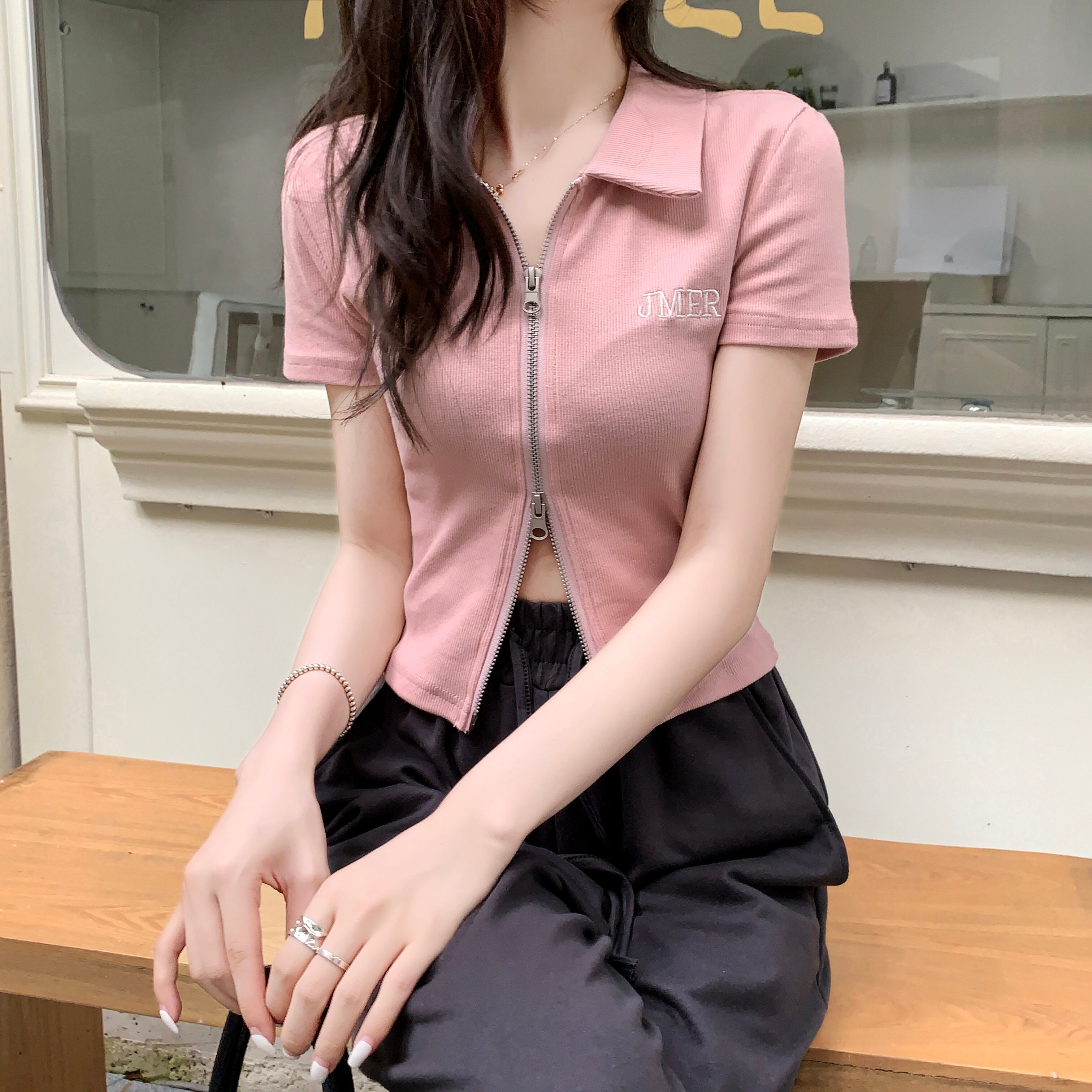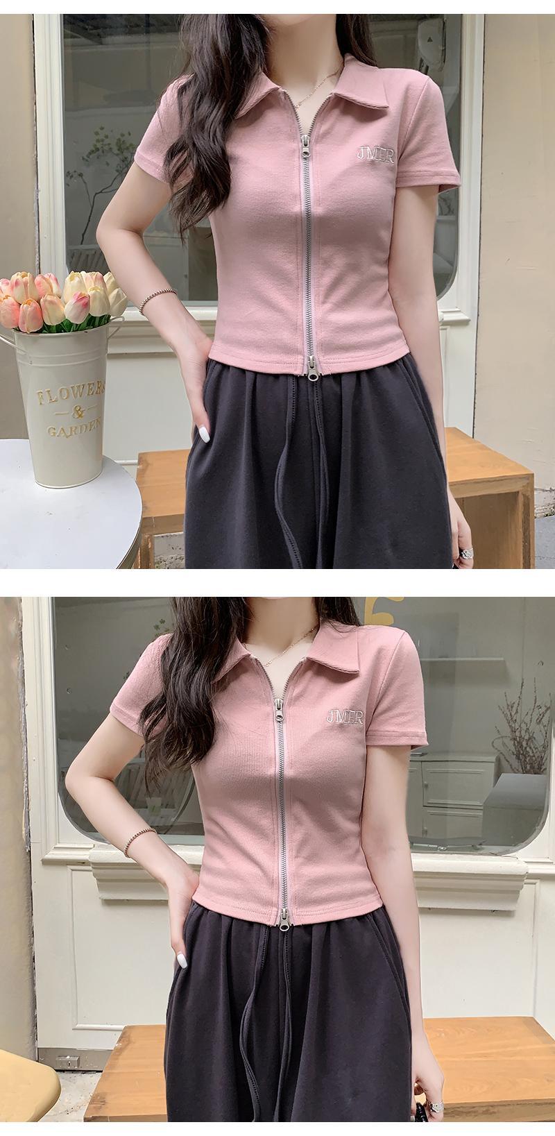 カラーショートTシャツ 薄手サマースリムフィットジッパートップス 夏物 s576147900733853