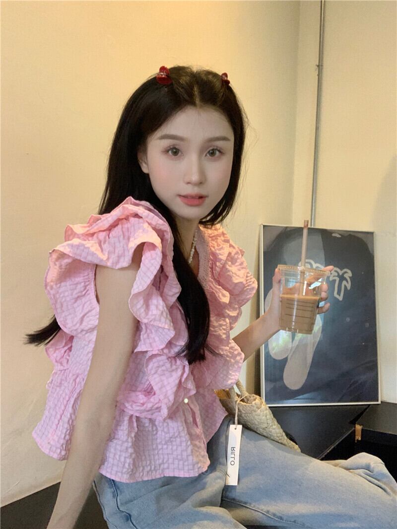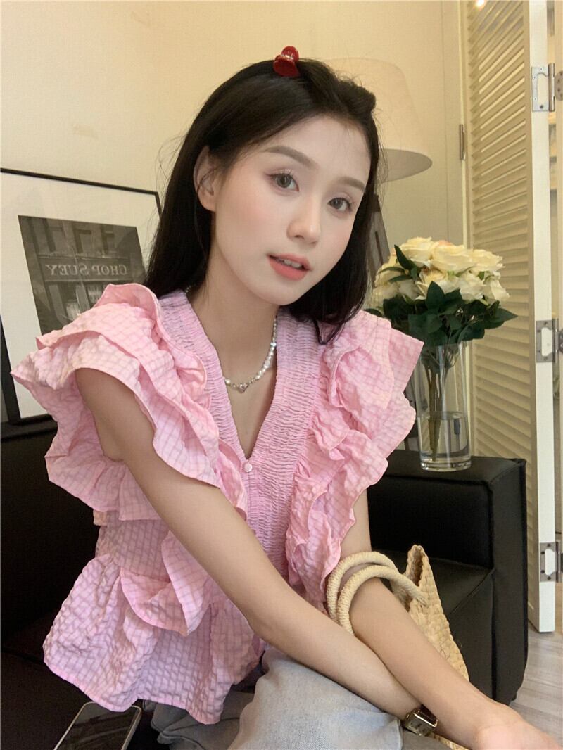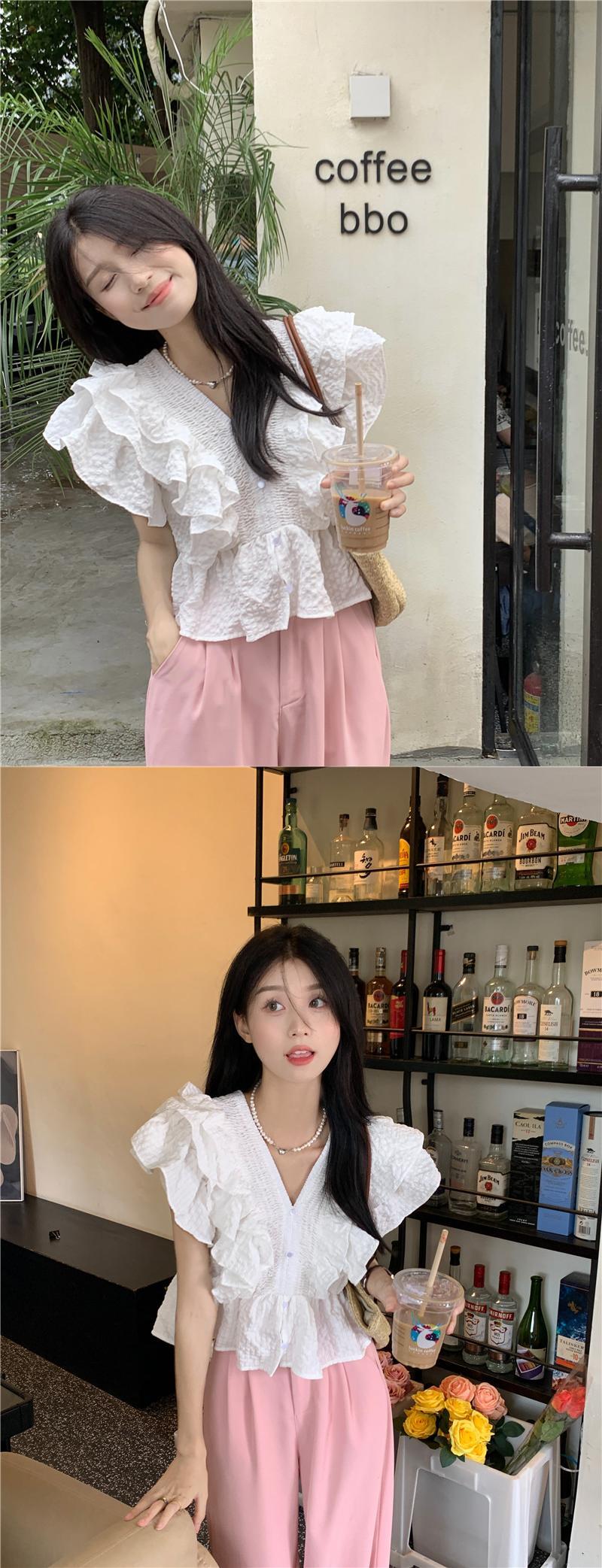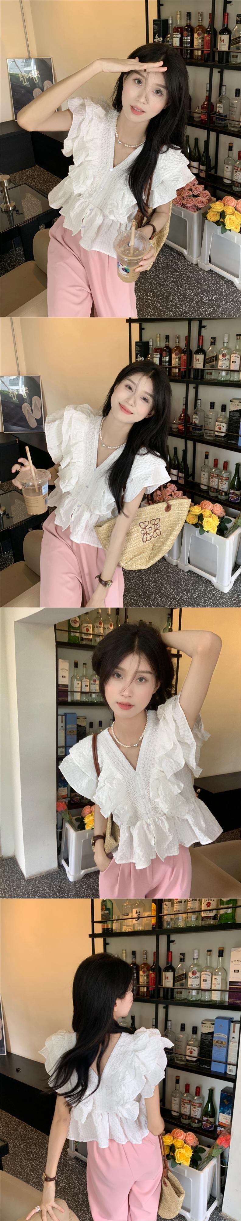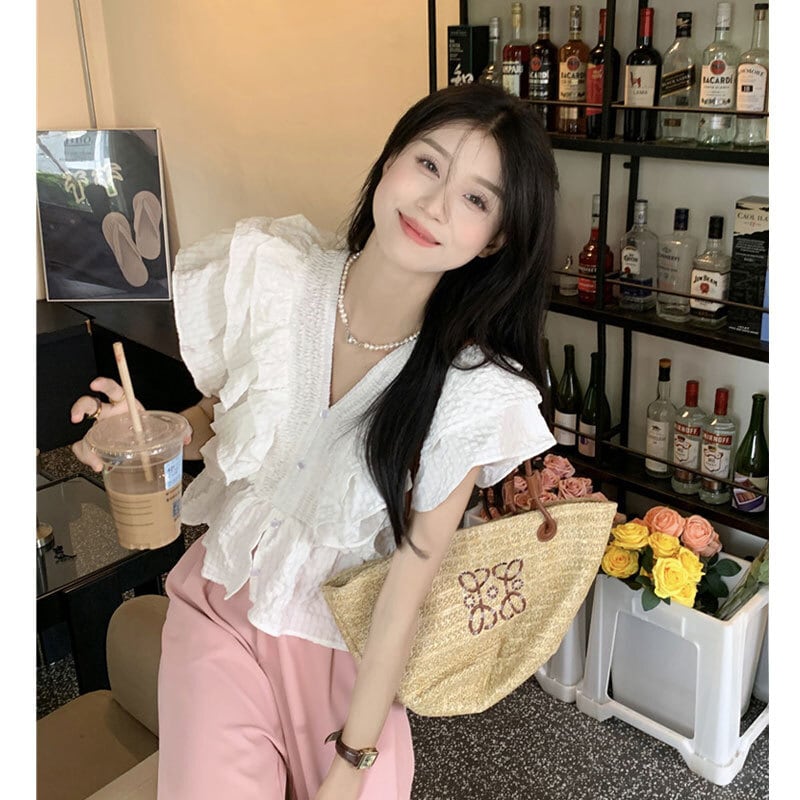 Vネックショートトップス サマースタイルホワイトスリーブシャツ 大人ガーリー スウィート キュート カジュアル 夏物 s576112974184581